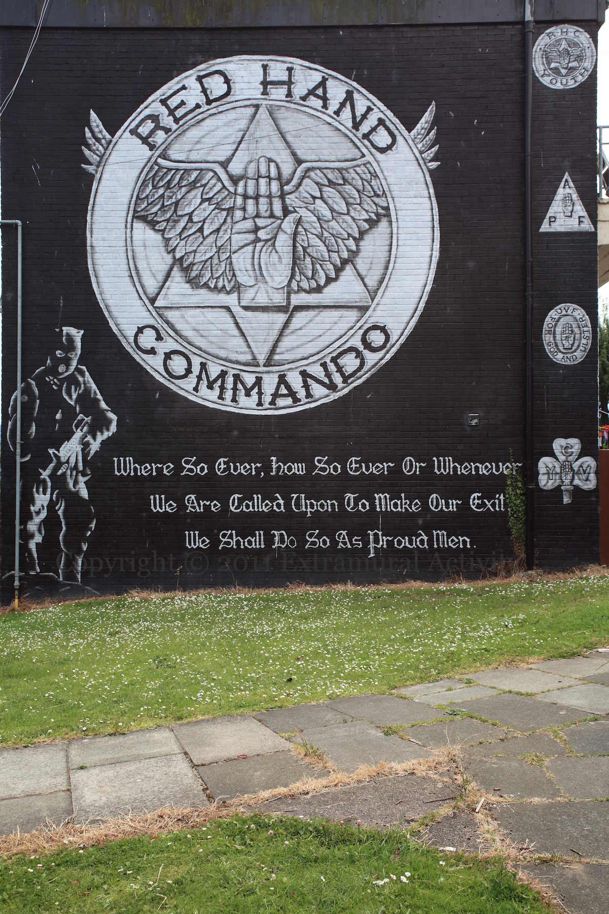“Where so ever, how so ever or whenever we are called upon to make our exit, we shall do so as proud men.” (Another UVF mural in east Belfast has “as free men”.) A hooded gunman from the Red Hand Commando stands at the ready. The first of the four crests is the (rare, possibly restricted to the Morven Park murals) “RHC Youth”; then PAF, UVF, and YCV. Morven Park, Ballybeen.