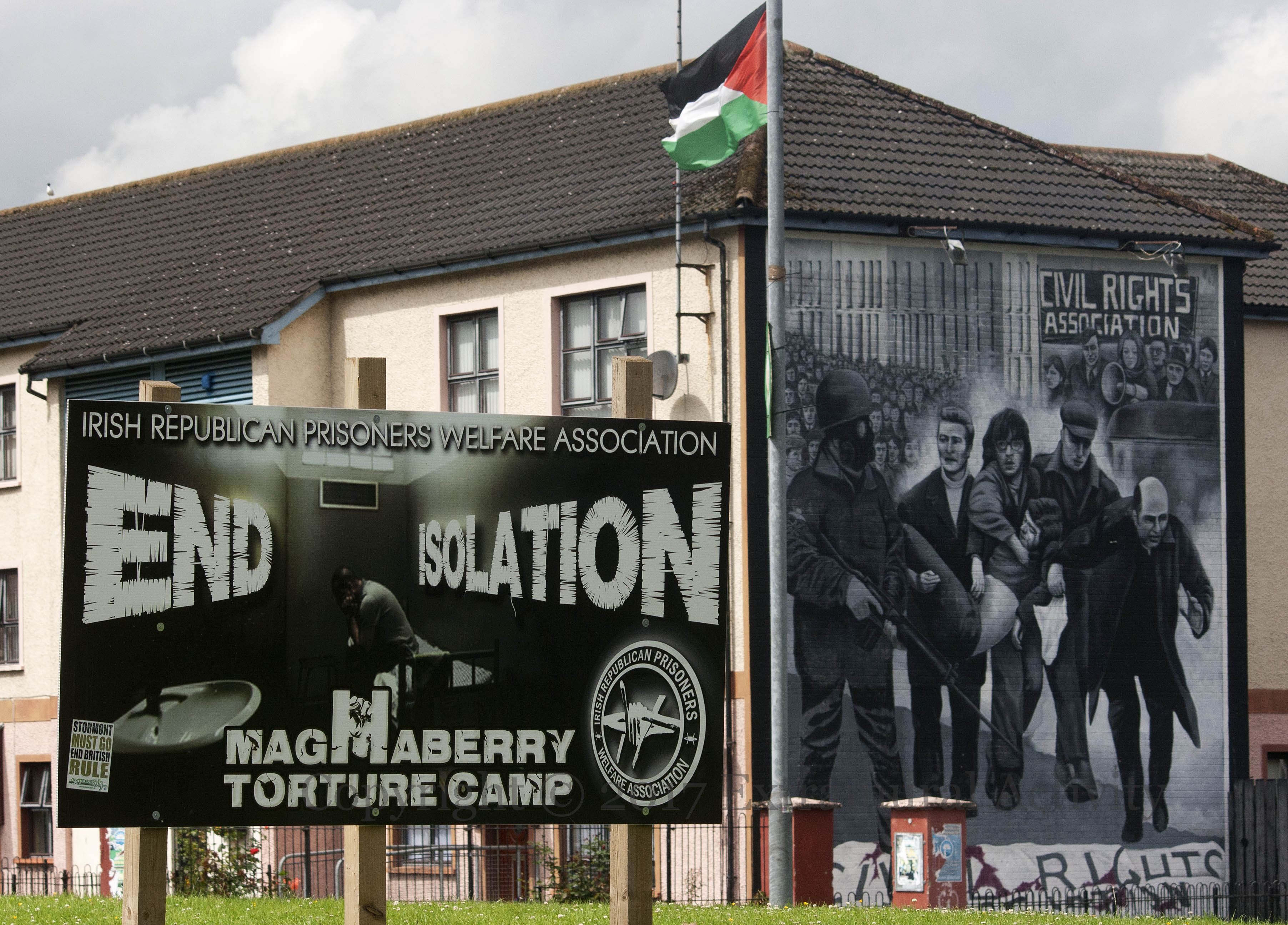 IRPWA (Fb | tw) board protesting the treatment of republican prisoners in Maghaberry “torture camp”, next to Free Derry Corner, with a Palestinian flag and the Bogside Artists’ Bloody Sunday mural in the background.