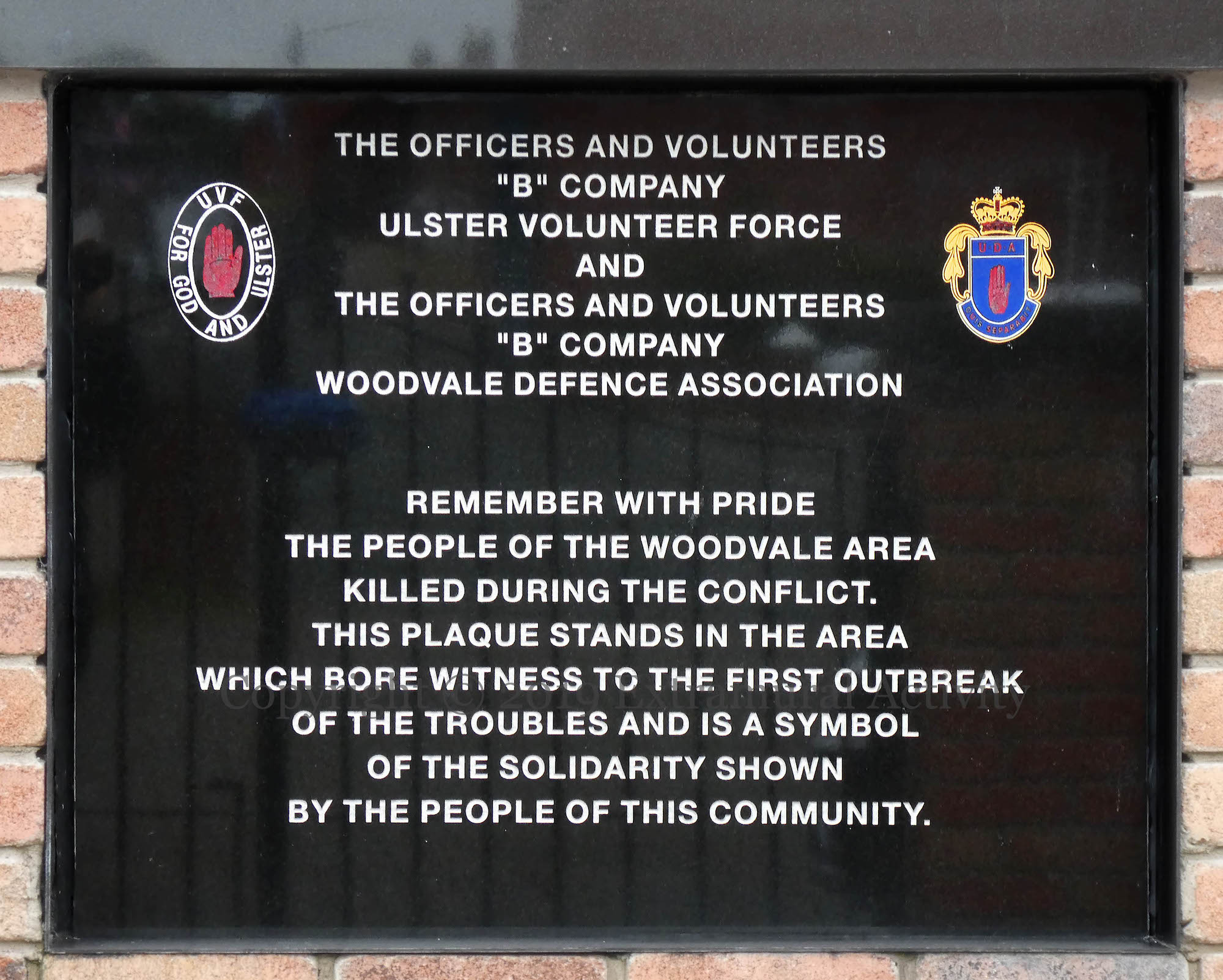 “The officers and volunteers “B” company Ulster Volunteer Force and the officers and volunteers “B” company Woodvale Defence Association remember with pride the people of the Woodvale area killed during the conflict. This plaque stands in the area which bore witness to the first outbreak of the troubles and is a symbol of the solidarity shown by the people of this community.