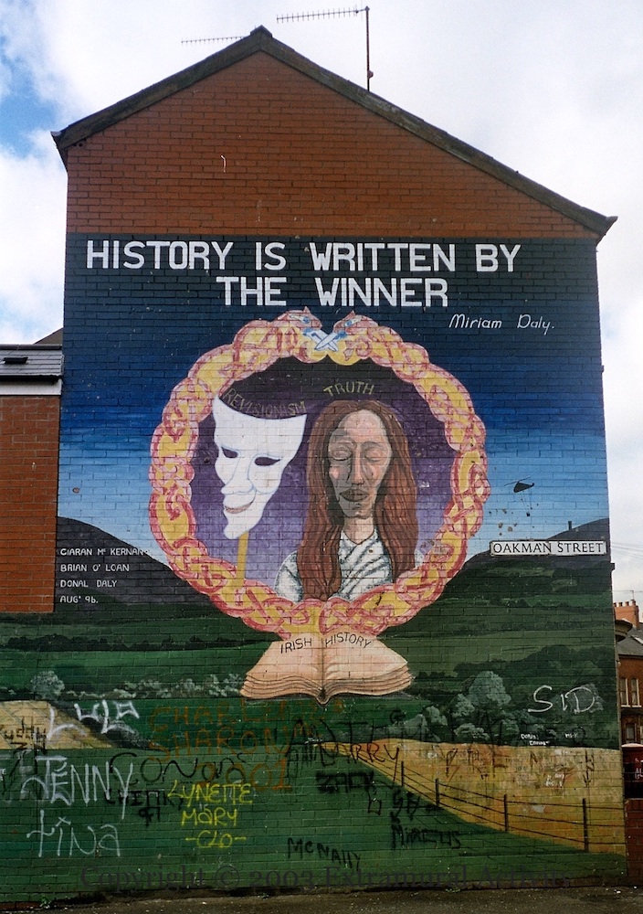 The mural was originally painted 1996 by Ciaran McKernan, Brian O’Loan, and Miriam’s son Donal Daly (you can see an in-progress shot by Sean Patrick Allen on his Facebook page) and is now in poor condition owing to all the graffiti along the bottom.