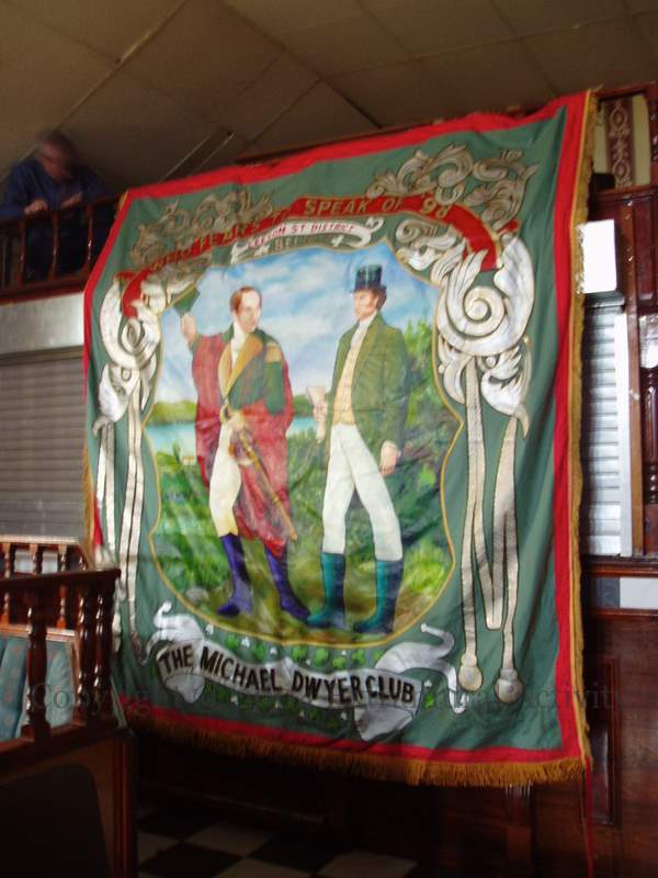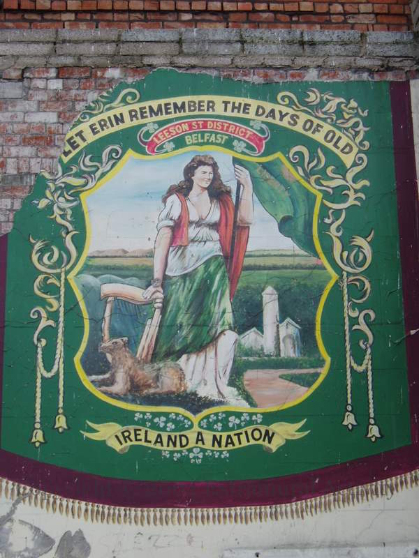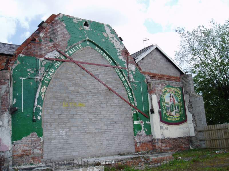 Here are some images of the exposed interior of the (old) Michael Dwyer’s GAA club on Grosvenor Road, Belfast, along with two (earlier) images of banners inside the club. The mural and first banner are of Ireland personified as a female with harp and wolfhound (and wearing green, white, and orange). The second banner is entitled “Who fears to speak of [17]98” (from the 1843 song) – Dwyer was also known as “The Wicklow Chieftain” for his exploits in the rebellion and the years following.