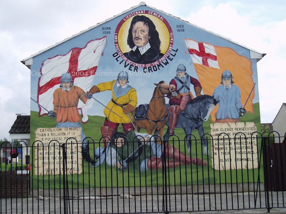 This is a lower Shankill mural of Oliver Cromwell, Lieutenant General, Lord Protector of the Protestant faith, born 1599, died 1658. “Catholicism is more than a religion, it is a political power. Therefore I’m led to believe there will be no peace in Ireland until the Catholic church is crushed.” “Our clergy persecuted and our Protestant churches desecrated. Also our Protestant people slaughtered in their thousands.”