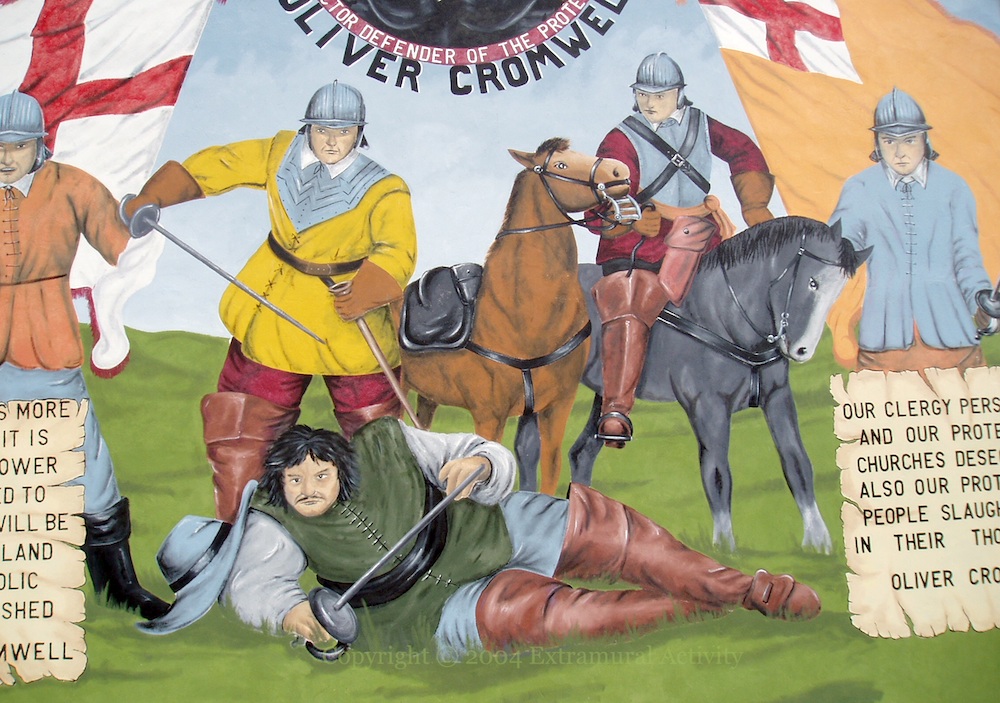 This is a lower Shankill mural of Oliver Cromwell, Lieutenant General, Lord Protector of the Protestant faith, born 1599, died 1658. “Catholicism is more than a religion, it is a political power. Therefore I’m led to believe there will be no peace in Ireland until the Catholic church is crushed.” “Our clergy persecuted and our Protestant churches desecrated. Also our Protestant people slaughtered in their thousands.”