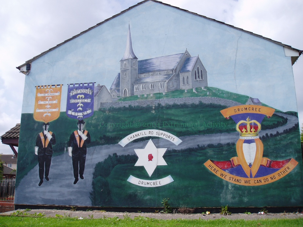 “We demand the right to march.” This mural in the lower Shankill is about the disputed Orange Order parade (WP entry, including a map of the route) to Drumcree Church in Portadown, part of which goes along the Garvaghy Road