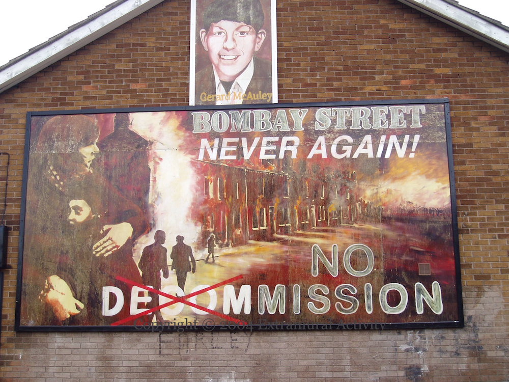 This Bombay Street board commemorates the 1969 riots which led to Bombay Street being being cut by the Cupar Way “peace” line.