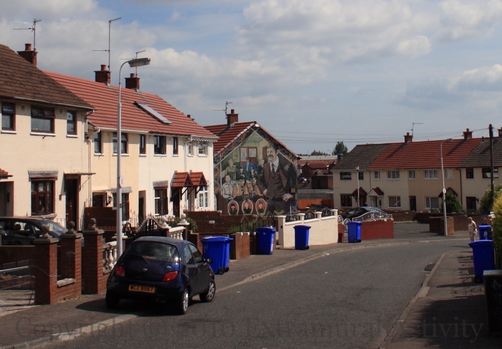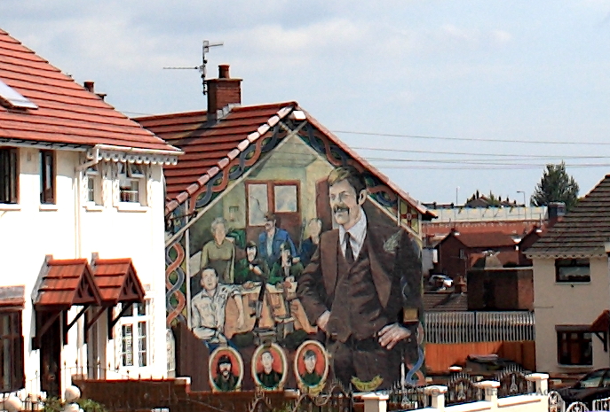 Tolan is also depicted at a larger scale on the right of the mural; in the original (2001) version, this figure was dressed in fatigues and carried a rifle (as can be seen in the Peter Moloney Collection), but this was changed within 18 months to a brown suit as shown here (July 2004).