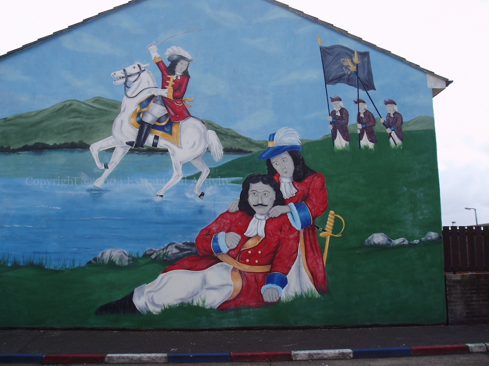 King Billy crossing the Boyne, with Schomberg dying in the foreground, making this a crude reproduction of Benjamin West’s 1780 painting ‘Battle Of The Boyne’. Second-in-command Schomberg had crossed the Boyne first and met his fate at the hands of Jacobite cavalry. Schomberg’s helper is perhaps George Walker, governor of Derry during the siege, who was shot and killed (reportedly) while attending to Schomberg – see George Walker in the Paddy Duffy collection.