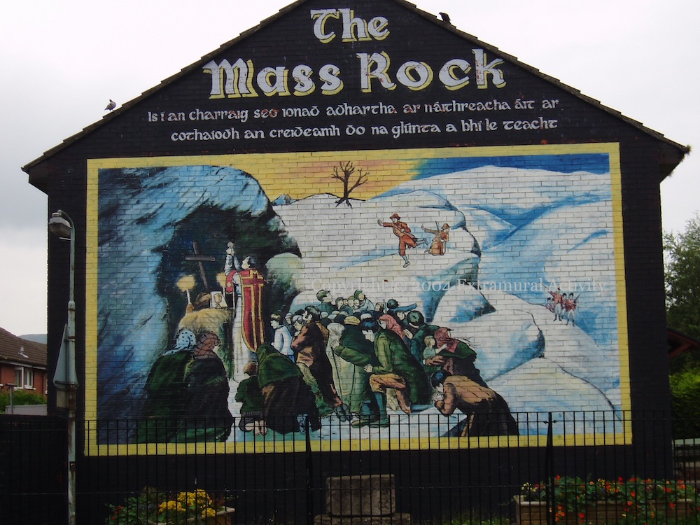 This mural commemorates the repression of Catholicism and use of mass rocks as secret locations in the days of Cromwellian conquest and the penal laws, c. 1650-1800. The 1652 Act Of Settlement banished Catholic priests from the island and services had to be held at short notice in remote locations, with sentries posted to keep watch against soldiers from the New Model Army. Laws against the practice of Catholicism in Ireland were not lifted until the 1782 Roman Catholic Relief Act (PCUG).