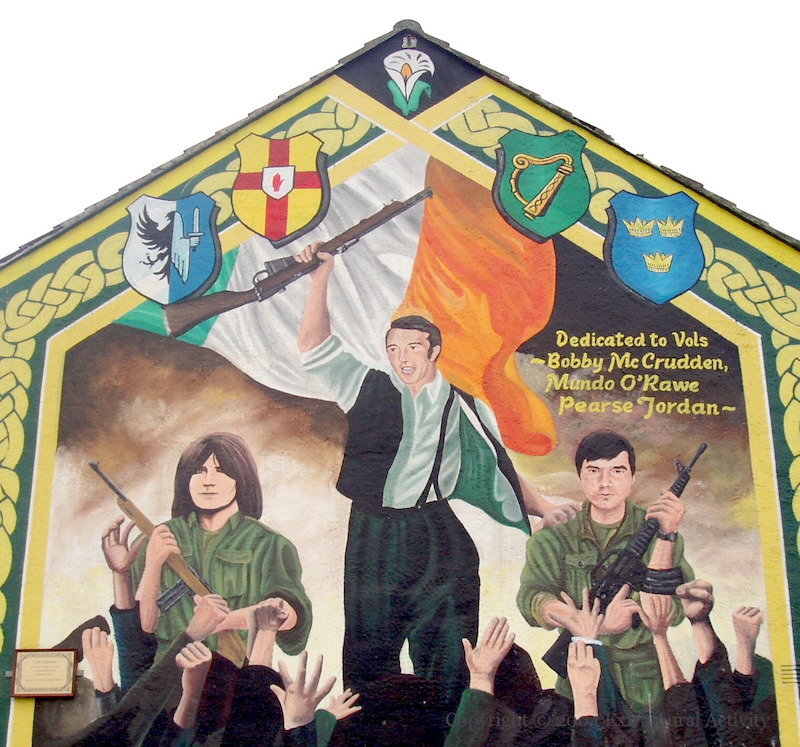 “In passing this mural, pause a little while, pray for us and Erin, then smile.” This is a Ballymurphy mural dedicated to three local PIRA volunteers: Bobby McCrudden, Mundo O’Rawe, and Pearse Jordan. McCrudden was shot in Ardoyne in 1972 (Sutton). O’Rawe was shot on the lower Falls in 1973 (Sutton). The circumstances of Jordan’s death in 1992 at the hands of an undercover RUC unit were controversial; his case went to the European Court Of Human Rights (WP).