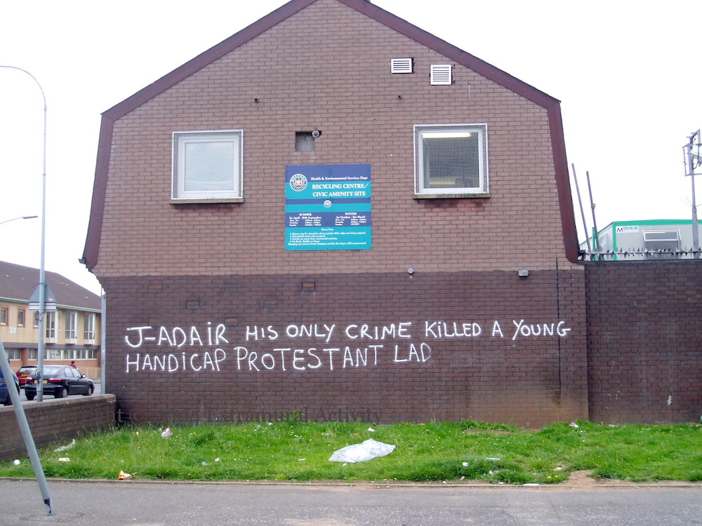 More graffiti referencing Johnny Adair: “J-Adair his only crime killed a young handicap Protestant lad”. The “lad” in question was Noel Cardwell, who had a mental age of 12. His crime was to tell the RUC the names of two men who had spiked his drink; they were UDA and friends of Adair. He was beaten and shot in the head (Sunday Mirror). Adair denied involvement and was not charged with the killing when arrested on charges of directing terrorism.
