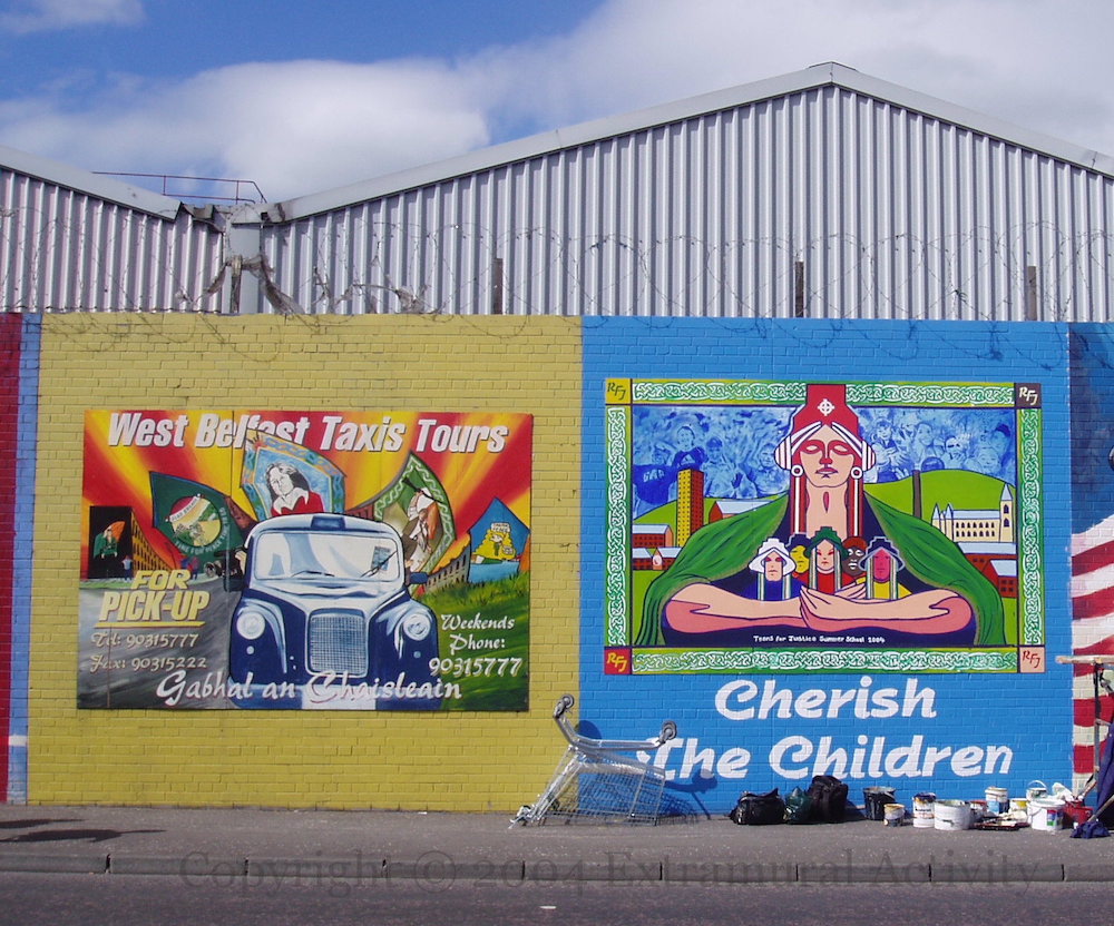 Taxi Tours – Cherish The Children 2004-08-062024-12-14Extramural Activity Boards for West Belfast Taxi Tours and a project by the “Teens for justice Summer School 2004“. The paint pots are for the Operation Iraqi Liberation (OIL) mural being painted to the right. Click image to enlargeCopyright © 2004 Seosamh Mac CoılleX00110 Rate ThisShare this: Click to email a link to a friend (Opens in new window) Email Click to share on Mastodon (Opens in new window) Mastodon Click to share on Reddit (Opens in new window) Reddit Click to share on Bluesky (Opens in new window) Bluesky Like Loading...