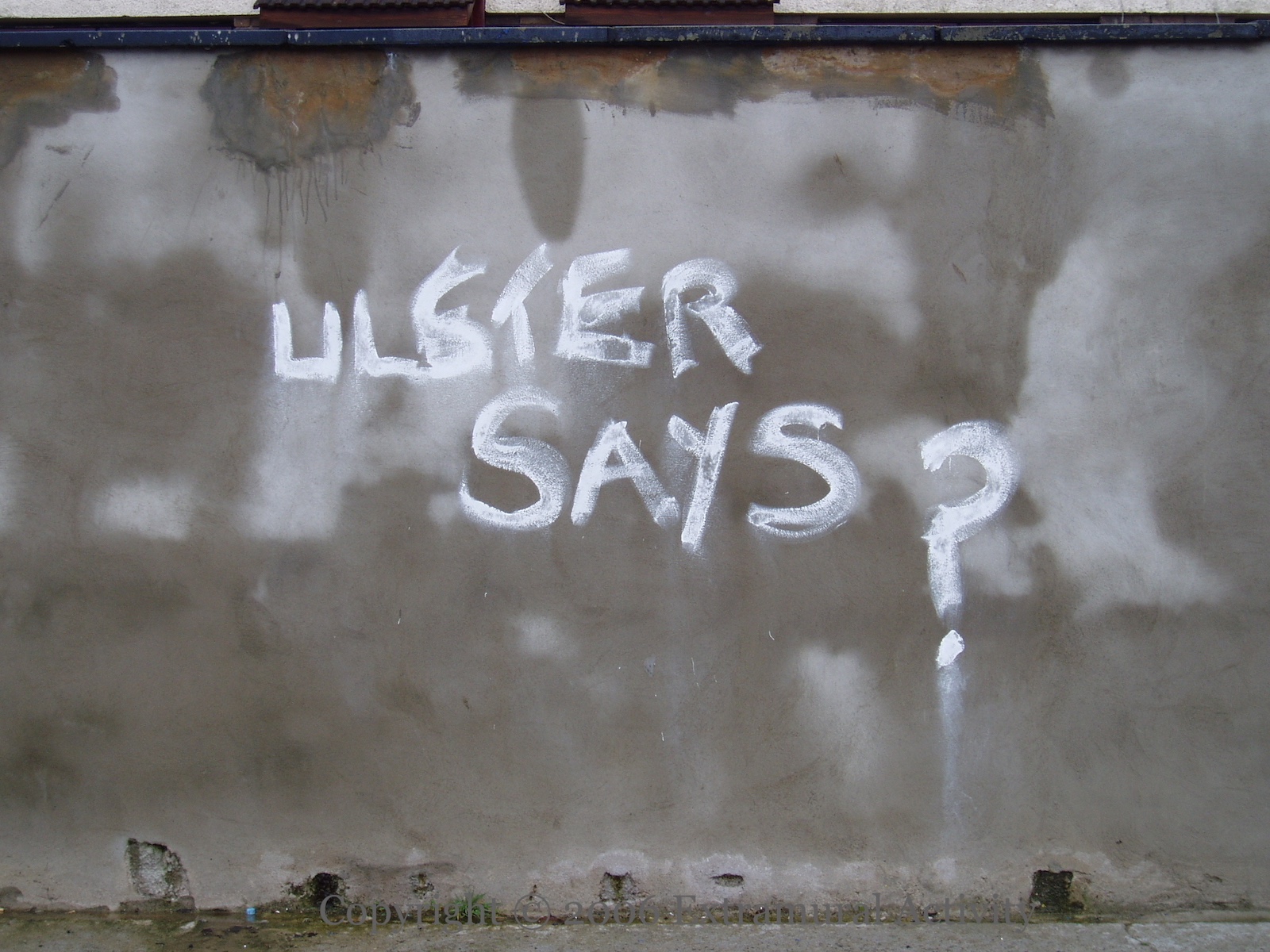 Ulster Says ? 2006-03-282024-12-15Extramural Activity Ulster typically says “no” (going back to 1985, at least) but this Ballysillan Road graffitist is not so sure. Click image to enlargeCopyright © 2006 Seosamh Mac CoılleX05913 Rate ThisShare this: Click to email a link to a friend (Opens in new window) Email Click to share on Mastodon (Opens in new window) Mastodon Click to share on Reddit (Opens in new window) Reddit Click to share on Bluesky (Opens in new window) Bluesky Like Loading...