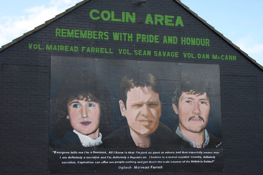 “Everyone tells me I’m a feminist. All I know is that I’m just as good as others, and that especially means men. I am definitely a socialist and I’m definitely a Republican. I believe in a united socialist country, definitely socialist. Capitalism can offer our people nothing and yet that’s the main interest of the British in Ireland – Oglach [sic] Maıréad Farrell.” Farrell was one of the Gibraltar 3 (along with Sean Savage and Dan McCann), killed by SAS soldiers in 1988. Painted by Rısteard Ó Murchú.