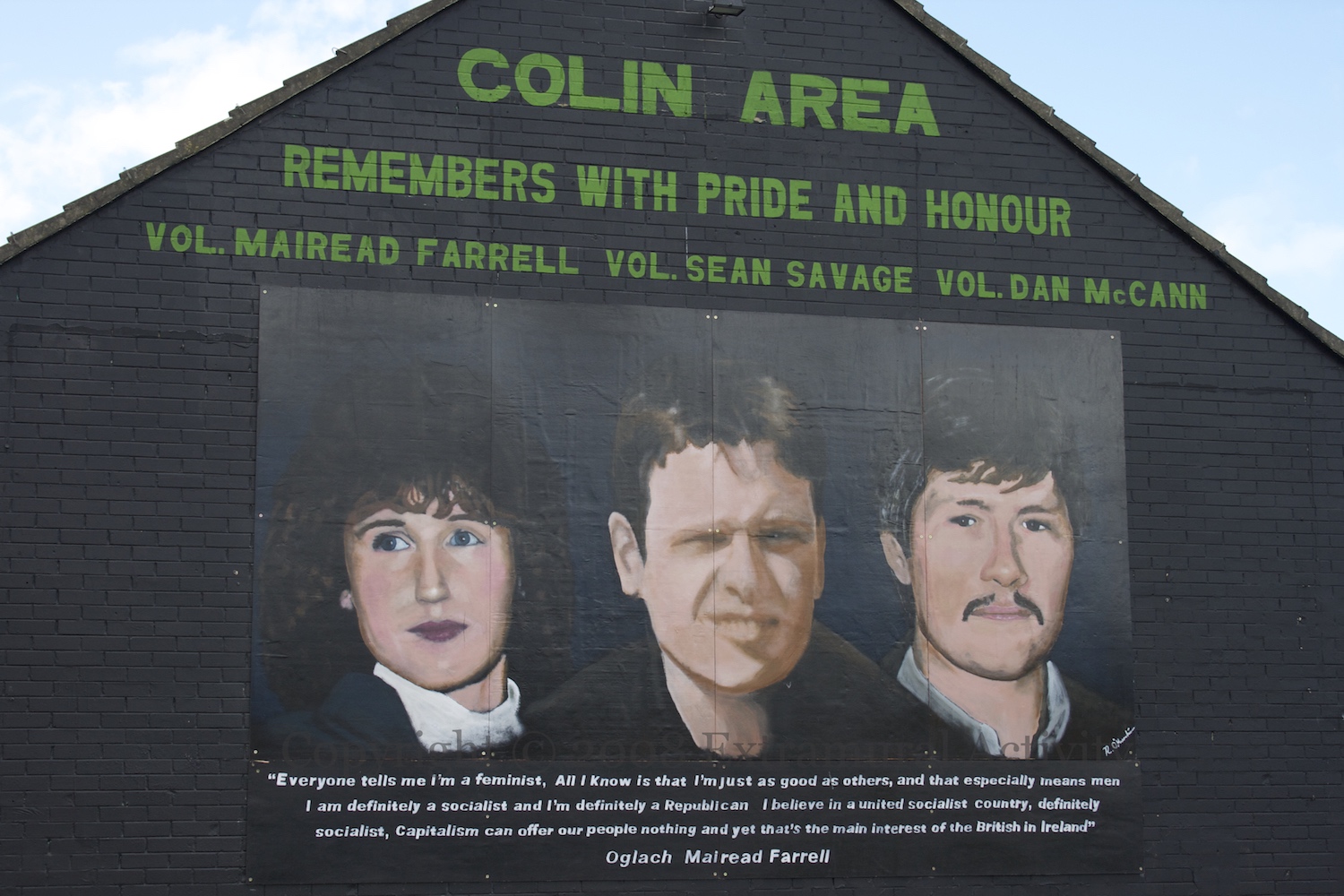 “Everyone tells me I’m a feminist. All I know is that I’m just as good as others, and that especially means men. I am definitely a socialist and I’m definitely a Republican. I believe in a united socialist country, definitely socialist. Capitalism can offer our people nothing and yet that’s the main interest of the British in Ireland – Oglach [sic] Maıréad Farrell.” Farrell was one of the Gibraltar 3 (along with Sean Savage and Dan McCann), killed by SAS soldiers in 1988. Painted by Rısteard Ó Murchú.