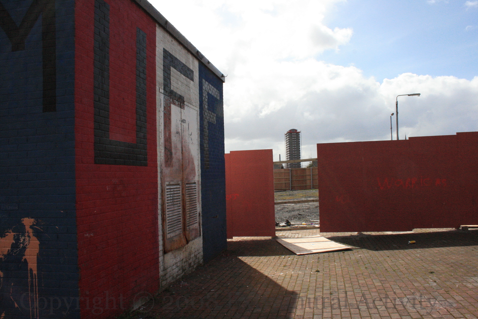These are images of three sides of the electrical sub-station beside Boundary Way (at the bottom of the lower Shankill estate) – the fourth side is up against the hoarding around the construction site. Divis tower is the distance.