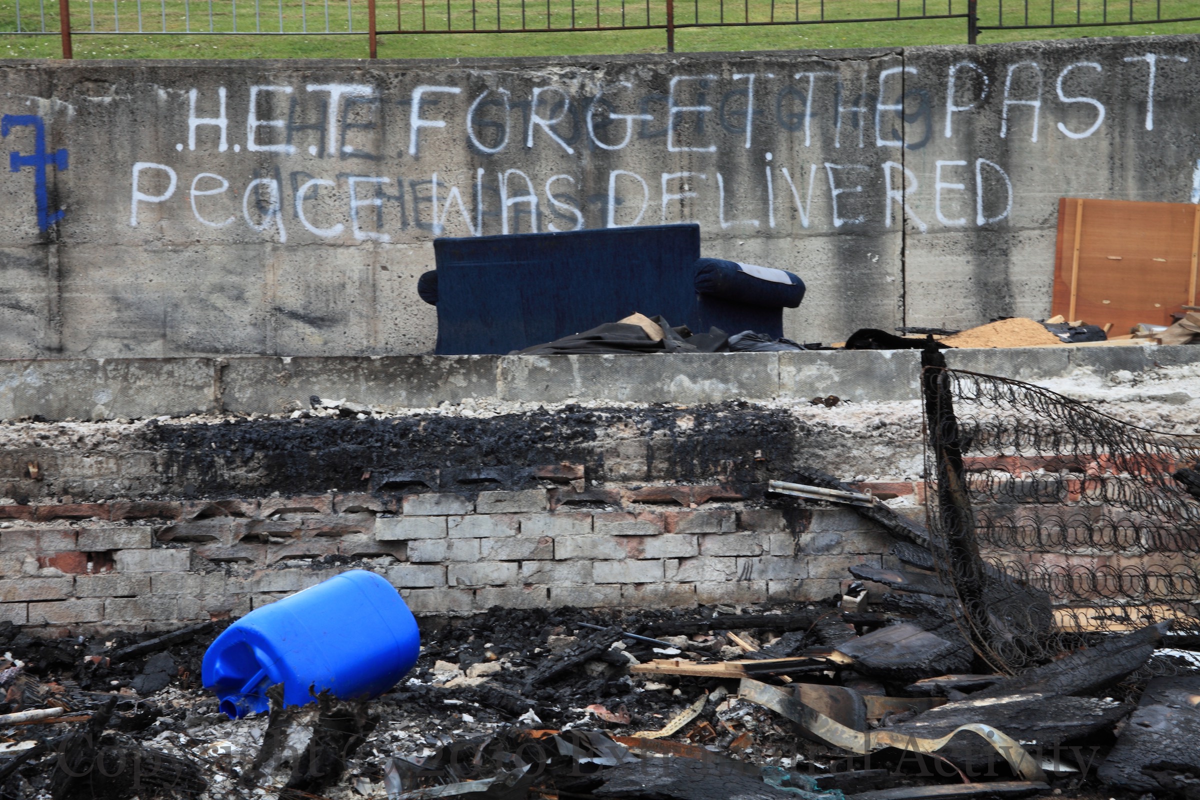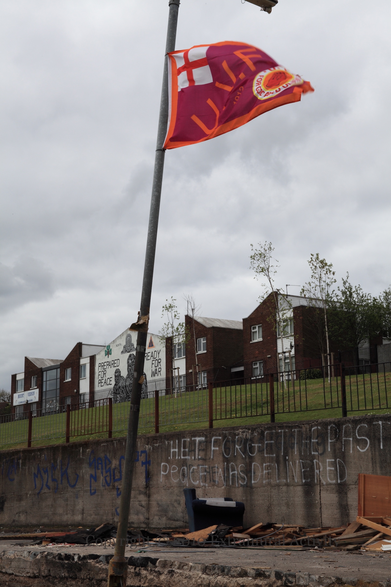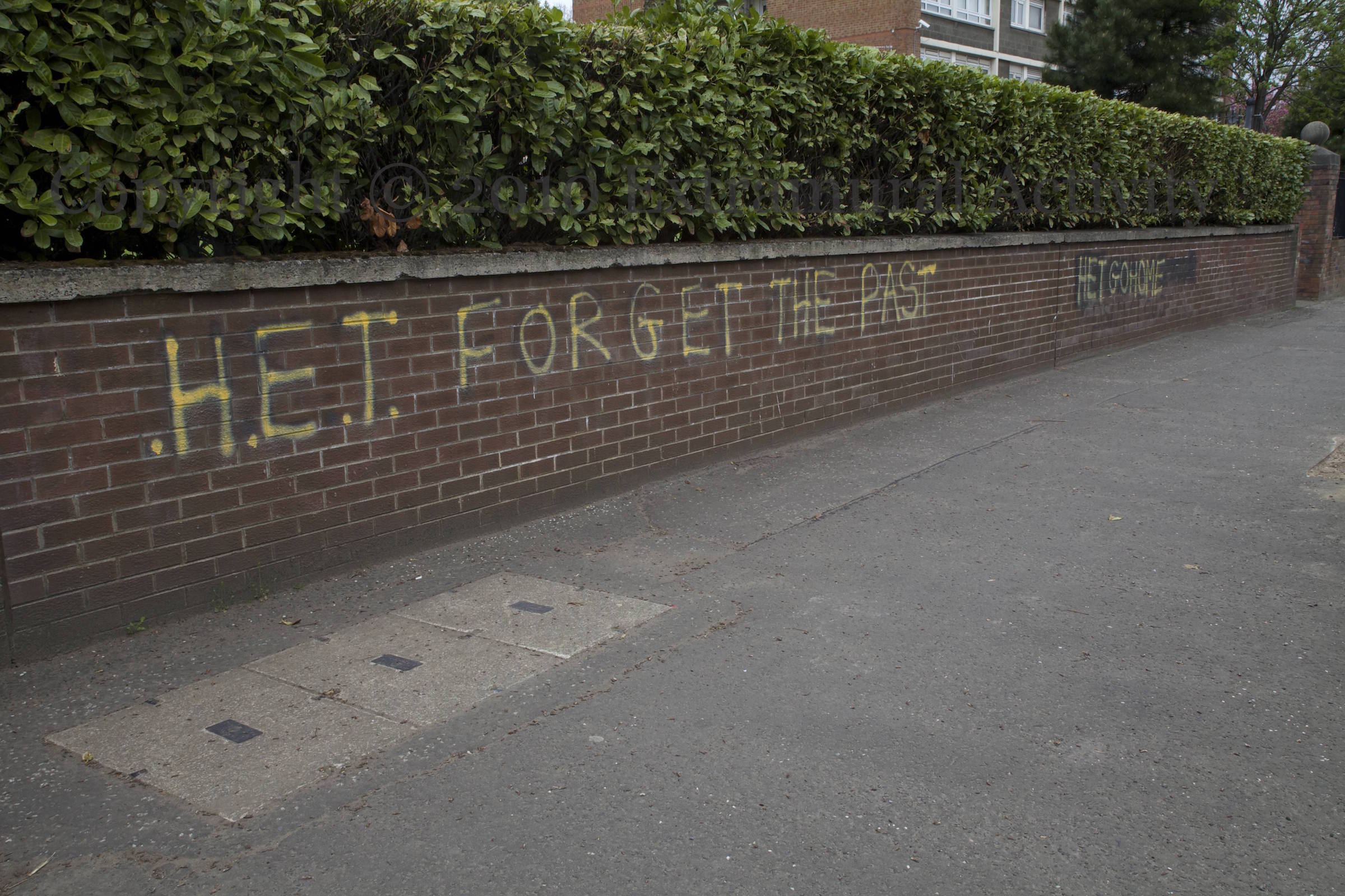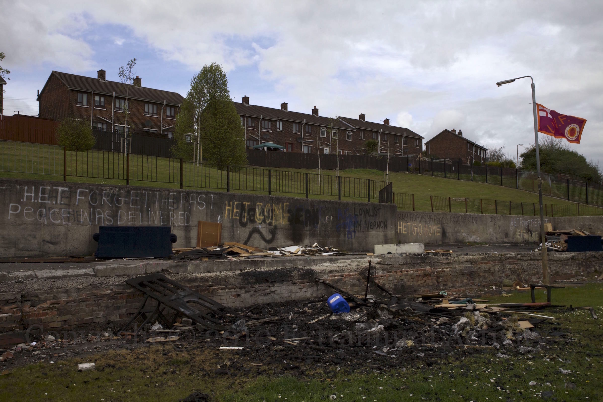 “HET” was the “Historical Enquiries Team”, investigating unsolved killings from the Troubles. It lasted from 2005 to 2014 (WP). The graffiti in these images from Mount Vernon and the Shore Road, are perhaps specifically in connection with the investigation into the UVF unit in the area (BelTel) and the murder of Jim Harbinson (BelTel). “Forget the past – peace was delivered”, “HET go home”, “Gerry Adams ya peado [sic] – root da kids”.