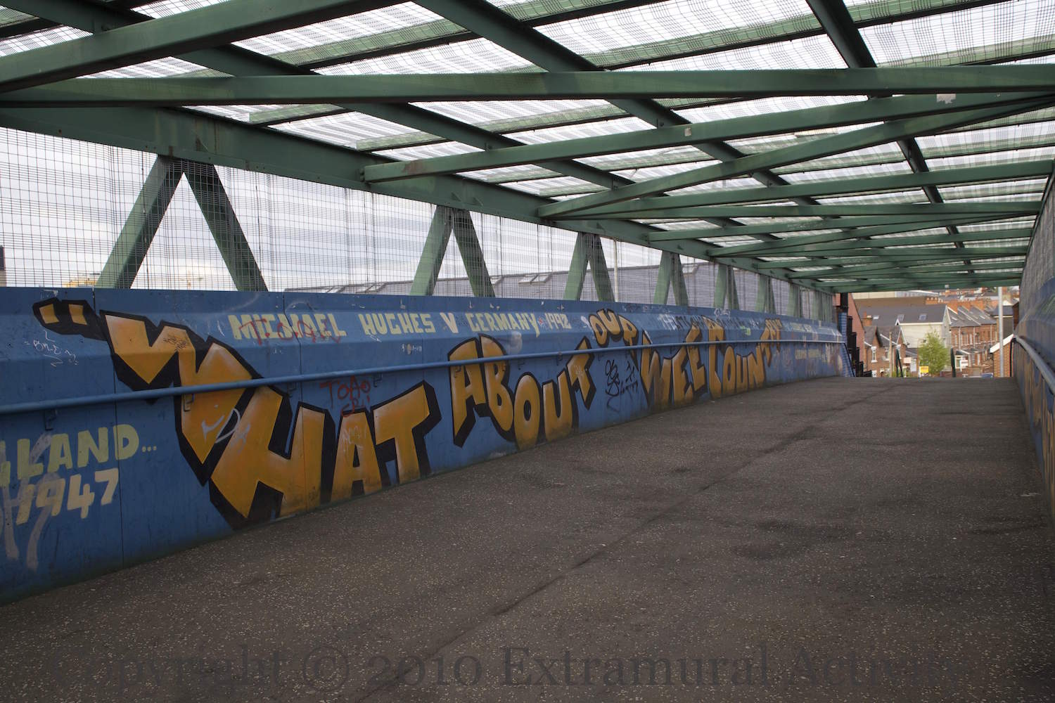 Highlights from Northern Ireland’s (football team) history on the footbridge from Windsor Avenue to Windsor Park (stadium). “N. Ireland v England 1947″,”Michael Hughes v Germany 1992”, and “George Best v Gordon Banks”. By Blaze FX.