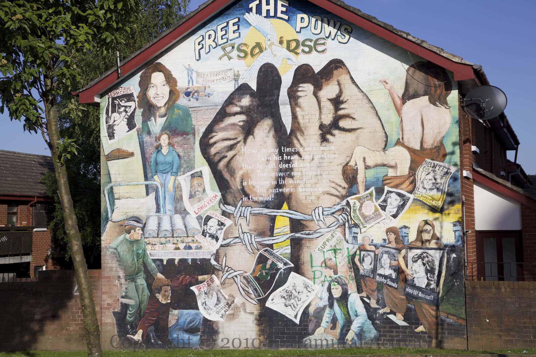This 1997 mural is a collage of images from the previous 30 years, including banging binlids on the ground, Maıréad Farrell in Armagh prison, men on the blanket, the cages of Long Kesh, marches in support of the hunger strikers, and reproductions of various posters, against Margaret Thatcher, plastic bullets, internment, and censorship. There’s a quote from Bob Dylan in the middle, “How many times can a man turn his head and pretend that he just doesn’t see – the answer, my friend, is blowing in the wind, the answer is blowing in the wind.”