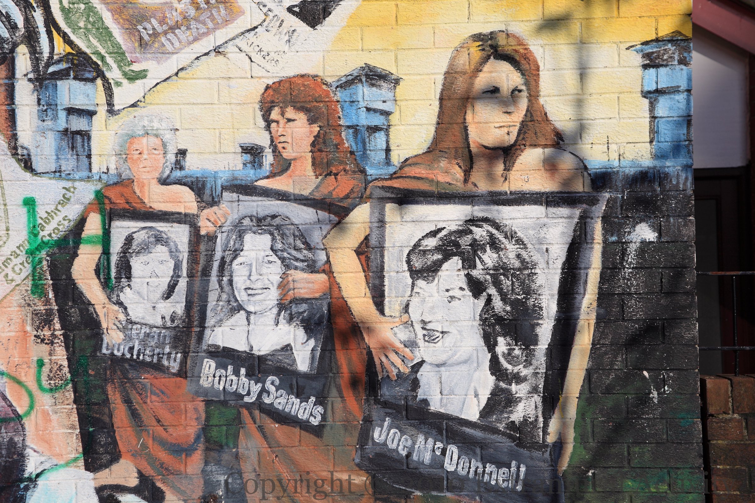 This 1997 mural is a collage of images from the previous 30 years, including banging binlids on the ground, Maıréad Farrell in Armagh prison, men on the blanket, the cages of Long Kesh, marches in support of the hunger strikers, and reproductions of various posters, against Margaret Thatcher, plastic bullets, internment, and censorship. There’s a quote from Bob Dylan in the middle, “How many times can a man turn his head and pretend that he just doesn’t see – the answer, my friend, is blowing in the wind, the answer is blowing in the wind.”