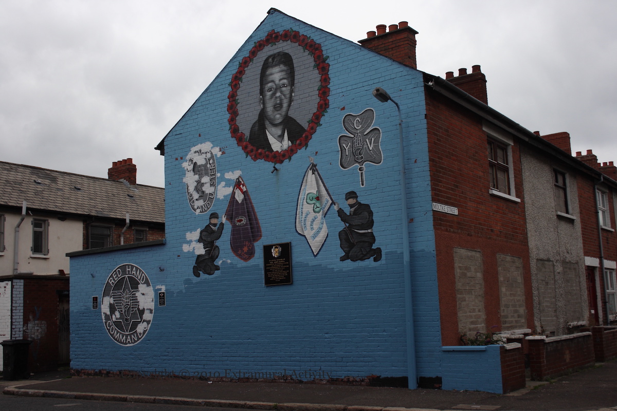 “In loving memory of Vol. John Hanna , murdered by the enemies of Ulster 10th September 1991. Always remembered by the offices and volunteers of 2nd Batt. “B” Coy Village. Its [sic] not for riches nor for glory but the love of one’s country which [we] are prepared to die for. Here lies a soldier. Gone but not forgotten. FGAU.” The two smaller plaques on either side of the RHC wings on the left are to “Friend Sammy Mehaffy 13th November 1991” and “Volunteer Stevie McCrea 18th February 1989”, both “murdered by the enemies of Ulster”.