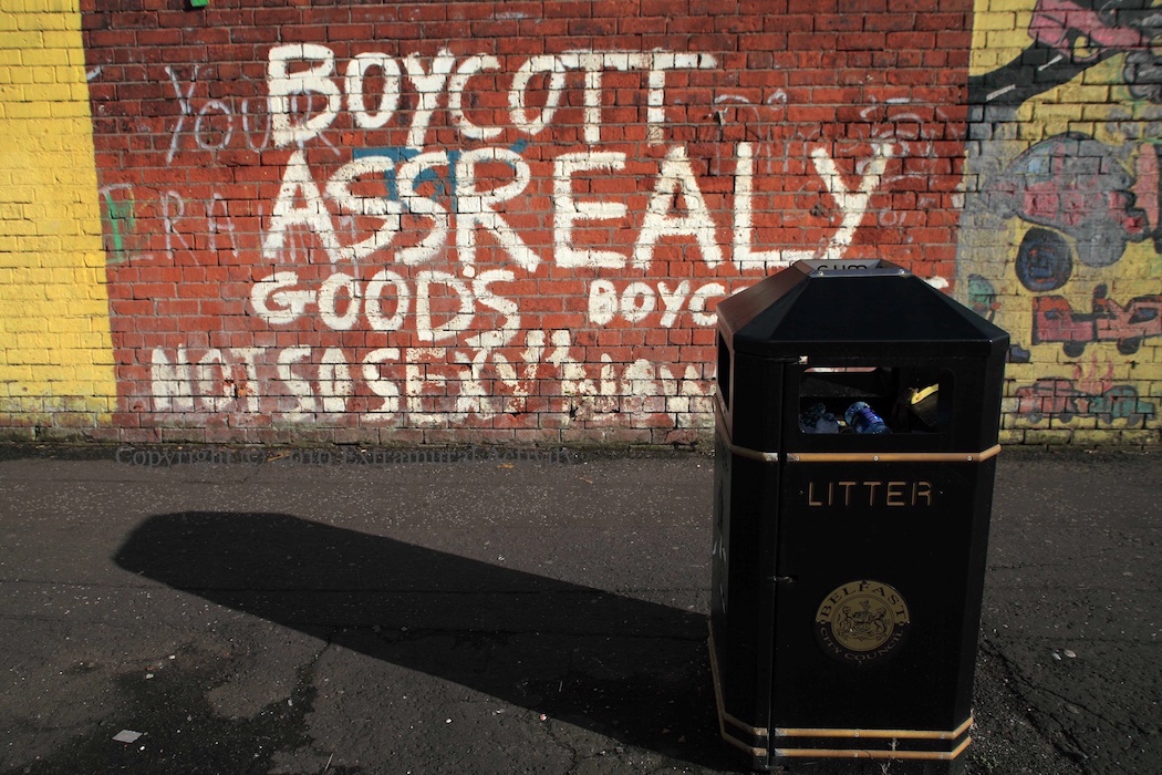 “Boycott Assrealy [Israeli] goods. Not so sexy now.” This graffito perhaps belongs to 2008 (see also Anti-Israel) but has recently been revealed by the removal of some Blackie Centre boards (Street View).