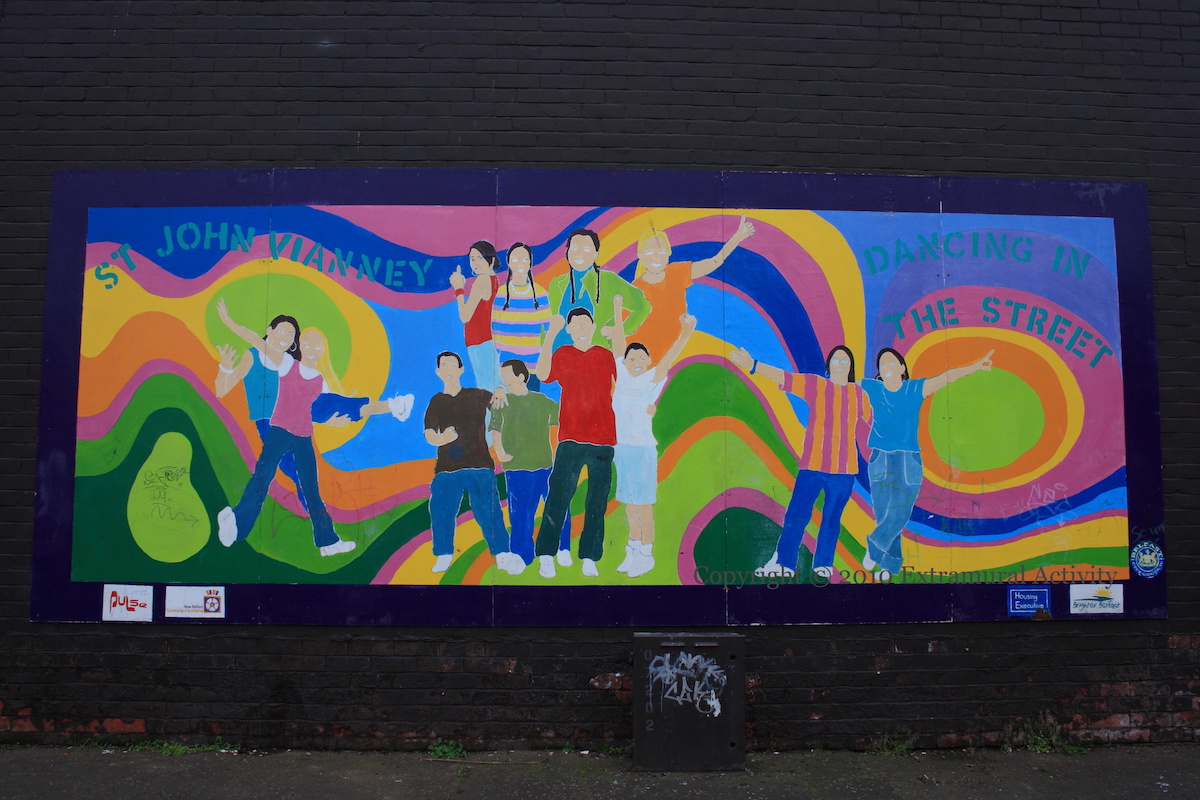 St John Vianney Youth Club is in River Terrace in the lower Ormeau area. This mural was supported by Pulse, the New Belfast Community Arts Initiative, the Housing Executive, and Brighten Belfast.