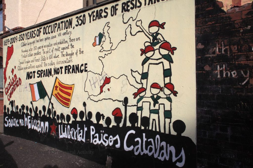 “1650-2009: 350 years of occupation, 350 years of resistance. Catalan language has been spoken since VIII century. Nowadays, after 350 years of occupation and prohibition, there are 9 million Catalan speakers. The spirit of revolt against the Spanish kingdom and French state is still alive. The struggle of the Catalan people continues against the existing discriminations. Not Spain, not France.” “Saoırse na hÉıreann, Llibrtat Països Catalans”.