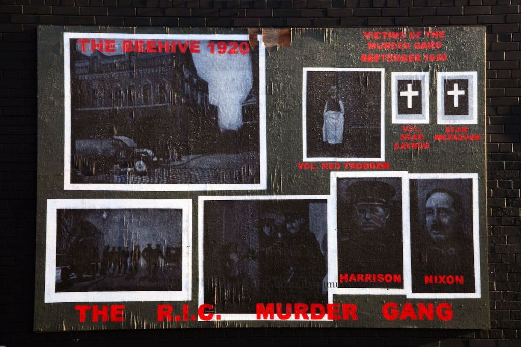 RIC Murder Gang 2010-11-142025-07-10Extramural Activity This is a 2010 close-up of the RIC Murder Gang mural previously discussed in 2007. Northumberland Street, west Belfast Click image to enlargeCopyright © 2010 Seosamh Mac CoılleX05962 Rate ThisShare this: Click to email a link to a friend (Opens in new window) Email Click to share on Mastodon (Opens in new window) Mastodon Click to share on Reddit (Opens in new window) Reddit Click to share on Bluesky (Opens in new window) Bluesky Like Loading...