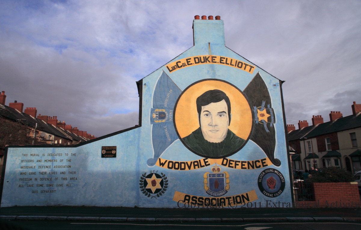 “This mural is dedicated to the officers and members of the Woodvale Defence Association who gave their lives and their freedom in defence of this are. All gave some, some gave all. Quis separabit.” The plaque reads: “This plaque is dedicated to the officers and members of ‘B’ Company WDA (UFF) who gave their lives and their freedom in defence of the Woodvale. Quis separabit.