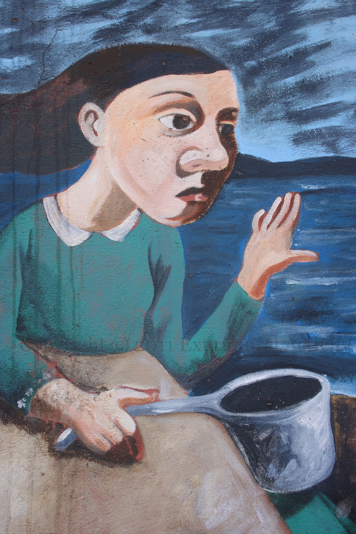 Queen Victoria and entourage paddle along the Irish shore at the end of the Great Hunger. (Here are one | two discussions of her visit and (un)involvement with famine relief.) Work by Rosie McGurran (Fb) in Linden Street, Belfast.