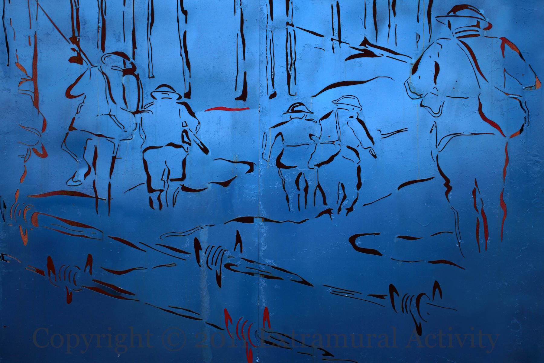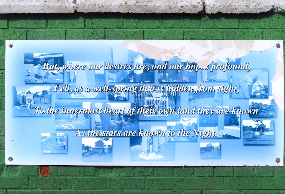 Update: As the images below from 2017 and 2018 show, the metalworks themselves have also been repainted (and replaced in a slightly different configuration), a new gate has been installed and the boards on the surrounding wall have been restored, against a freshly-painted background of green. The boards have verses from Laurence Binyon’s For The Fallen. “They mingle not with their laughing comrades again/They sit no more at familiar tables of home/They have no lot in our labour of the day-time/They sleep beyond Ulster’s [originally, England’s] foam.”