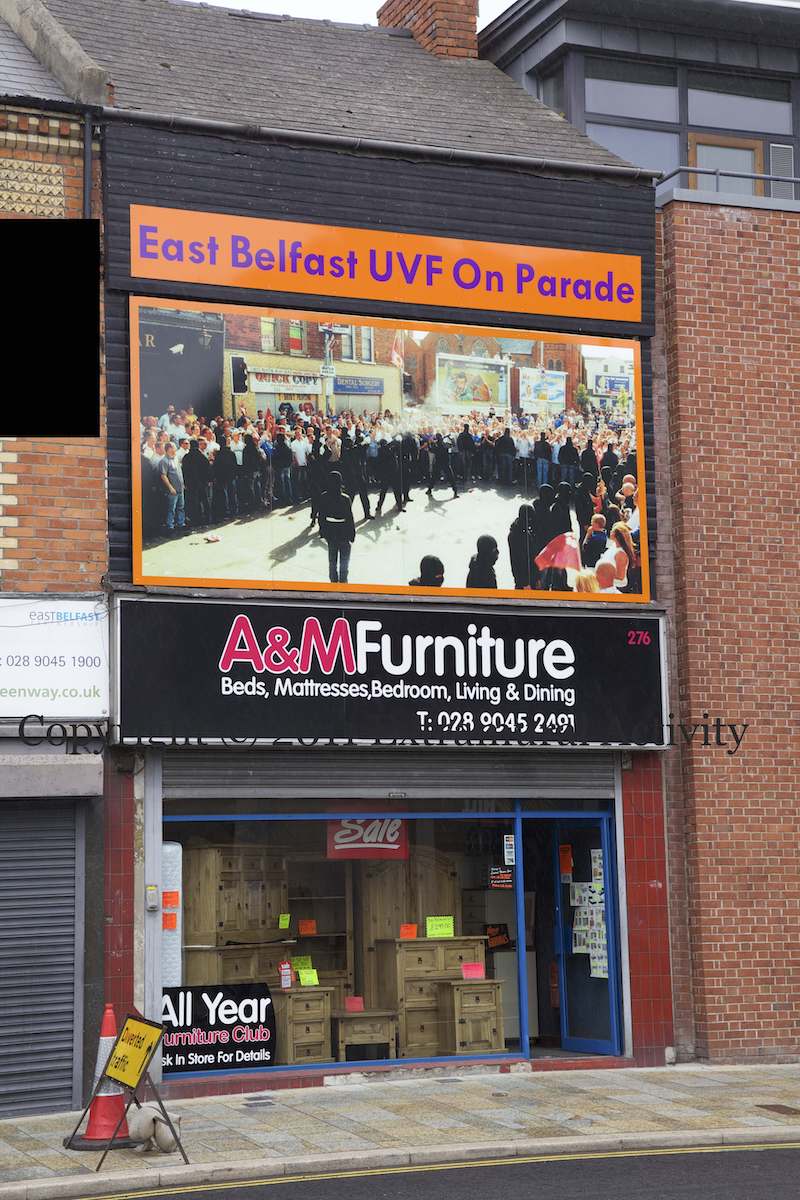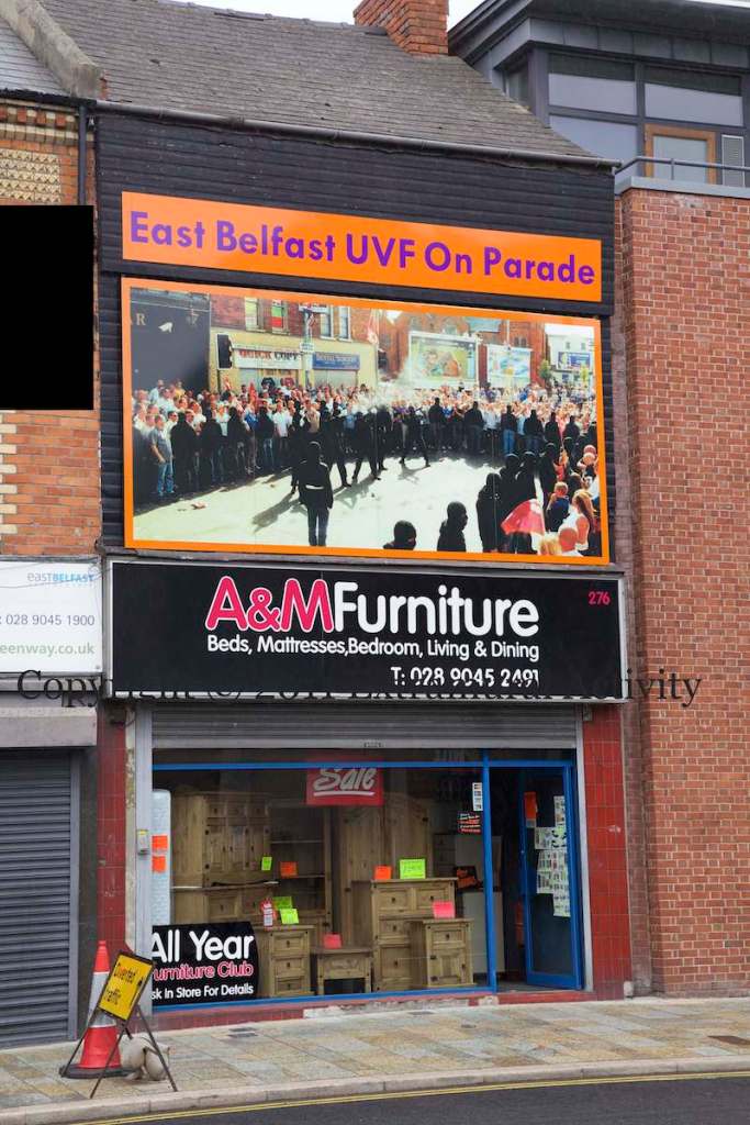 The mural appears to show a “show of strength” (firing into the air) rather than a parade, by hooded gunmen of the east Belfast UVF. The crowd is gathered on Newtownards Road at Dee Street, date unknown (but prior to 2008).