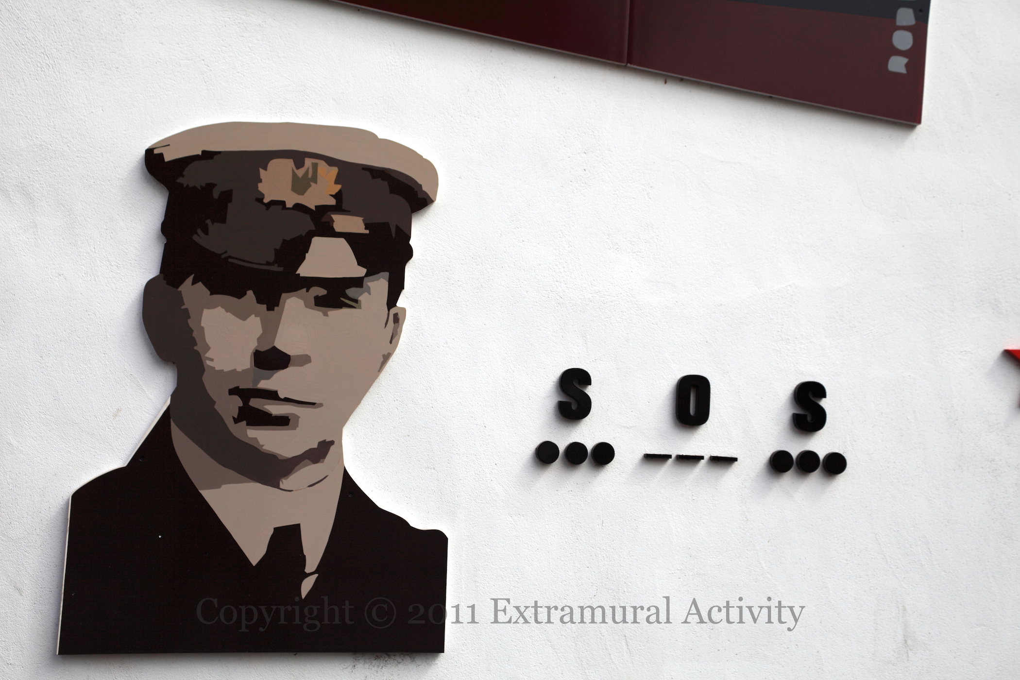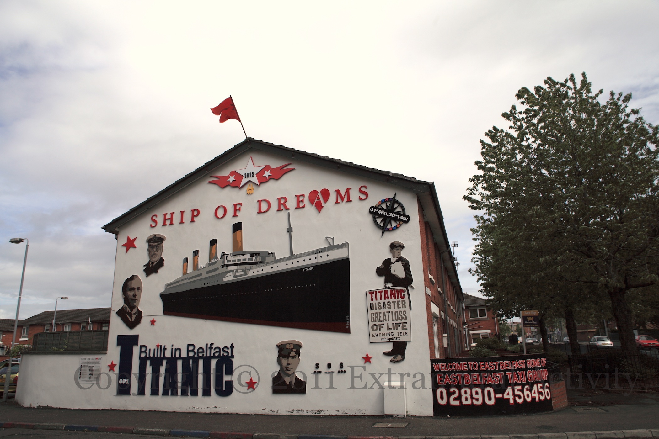 The White Star Line ship Titanic sank in the Atlantic in the early morning of April 15th, 1912, a thousand miles from New York (the co-ordinates are given in the top right), having been launched from Belfast’s Harland & Wolff shipyard, which is near this mural just off the Newtownards Road in east Belfast. The portraits are of Captain Edward Smith, architect Thomas Andrews, Jack Phillips (wireless officer), and paperboy Ned Parfett.