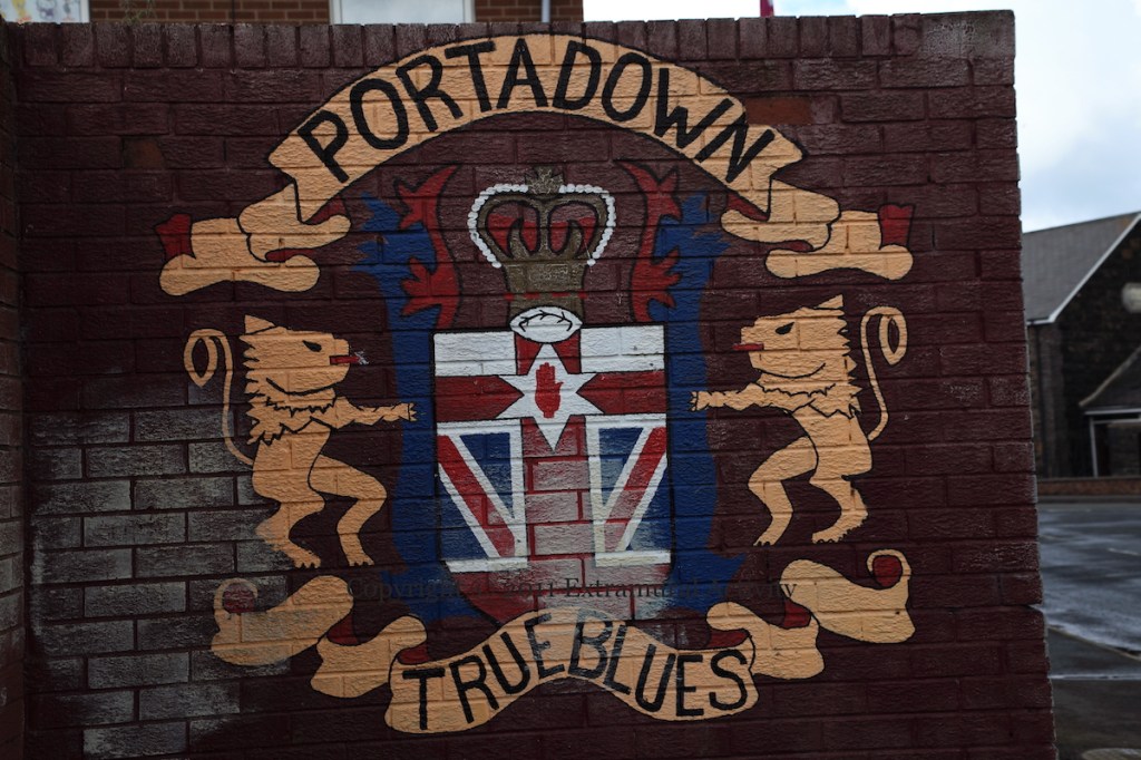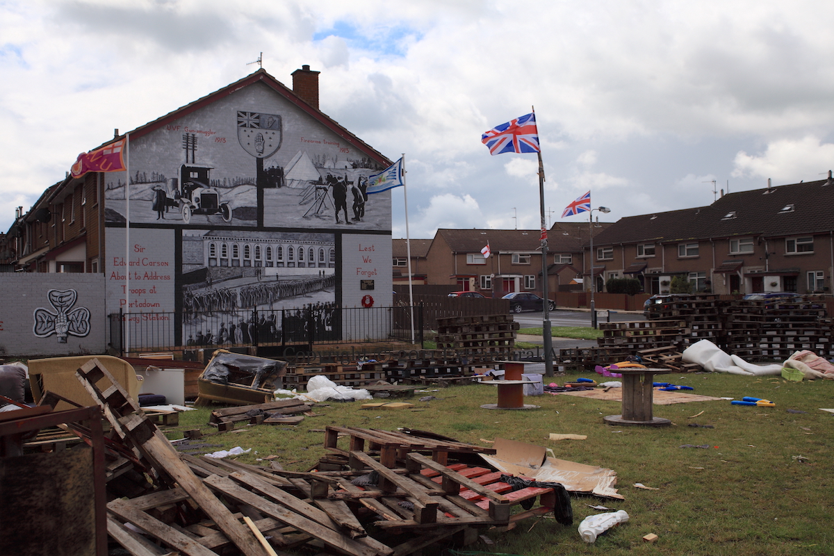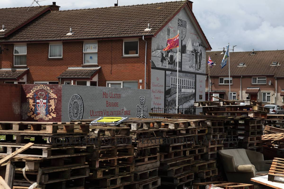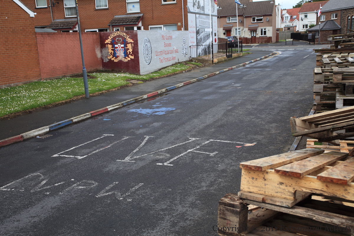 Pallets are collected for Eleventh night in the Edgarstown estate, in front of the murals on Union Street: from left to right: Portadown True Blues, Mid Ulster UVF, and the Ulster Volunteers. In the final image, “LVPW” [Loyalist Volunteer Prisoners’ Welfare] on the tarmac is modified (by the rival UVF) to become “DVPW” – “D” for “drugs”.