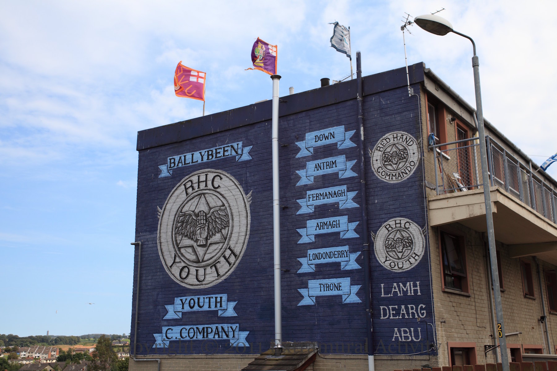 “Ballybeen Youth C. Company” Red Hand Commando, with the names of the six counties and the slogan “Lamh Dearg Abu” (a corruption of “Lámh Dhearg Abú”, “red hand to victory”).