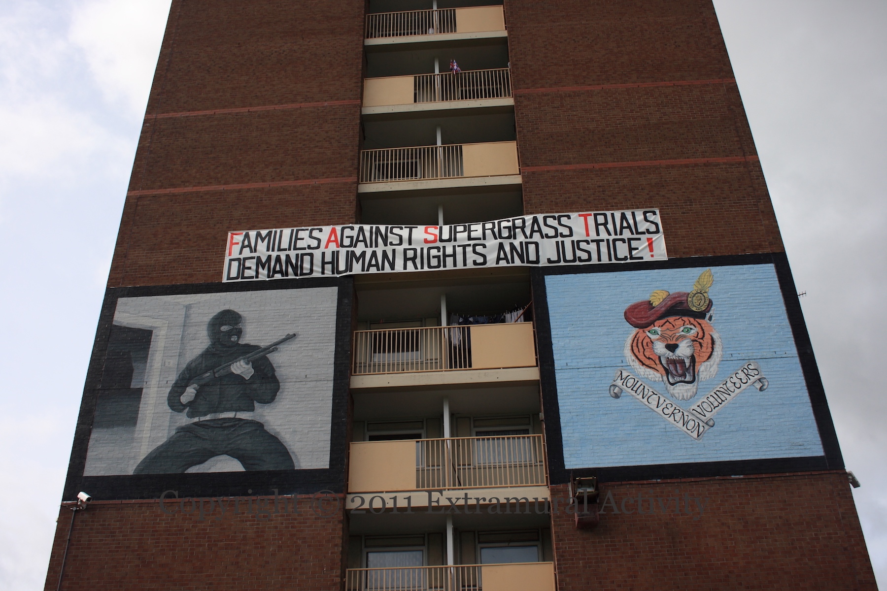 Families Against Supergrass Trials was formed to protest the first supergrass trial in 26 years (after the system collapsed during the trial), to begin on September 8th, related to the killing of Tommy English (Belfast Telegraph | BBC | BBC). The banner above is in Donegall Pass, the one below is on the Mount Vernon flats. There was another in Newtownards Road (Irish News). (And in 2012, one in Spier’s Place/Shankill Rd.)