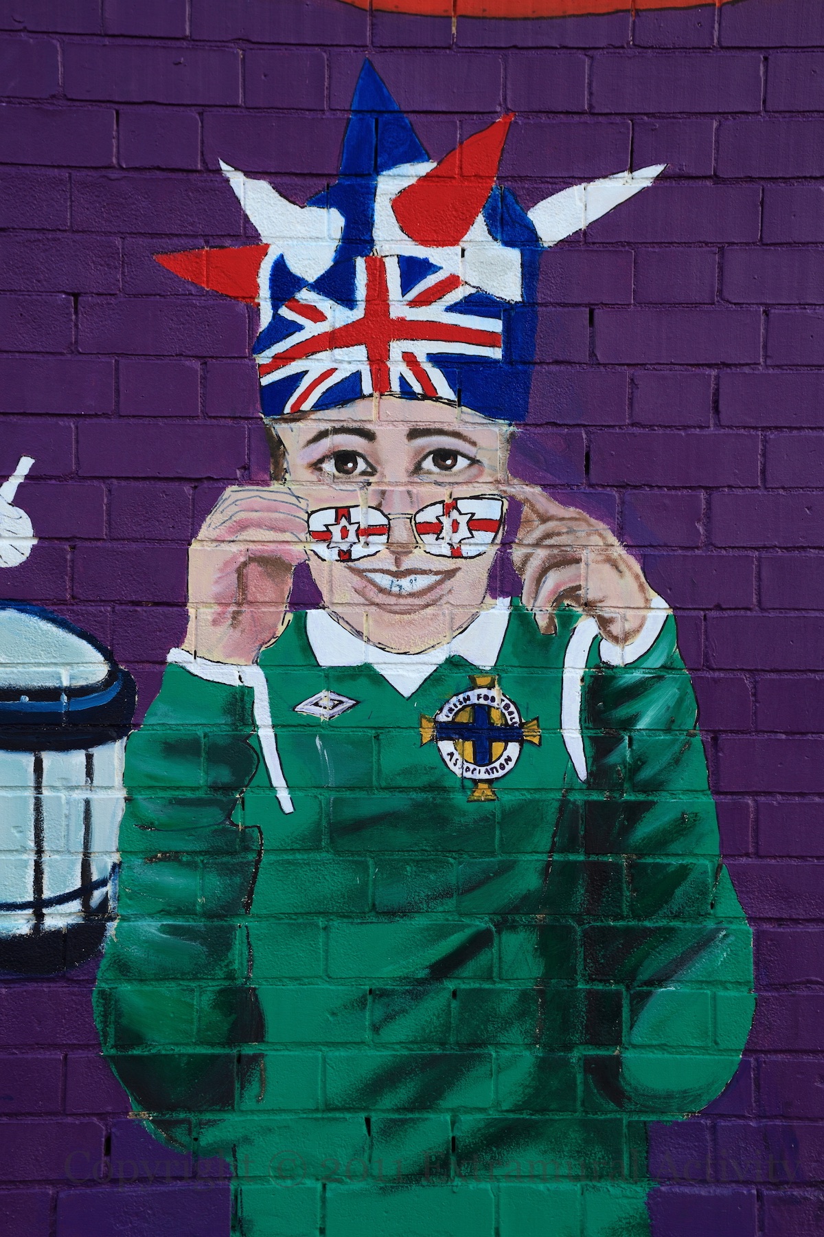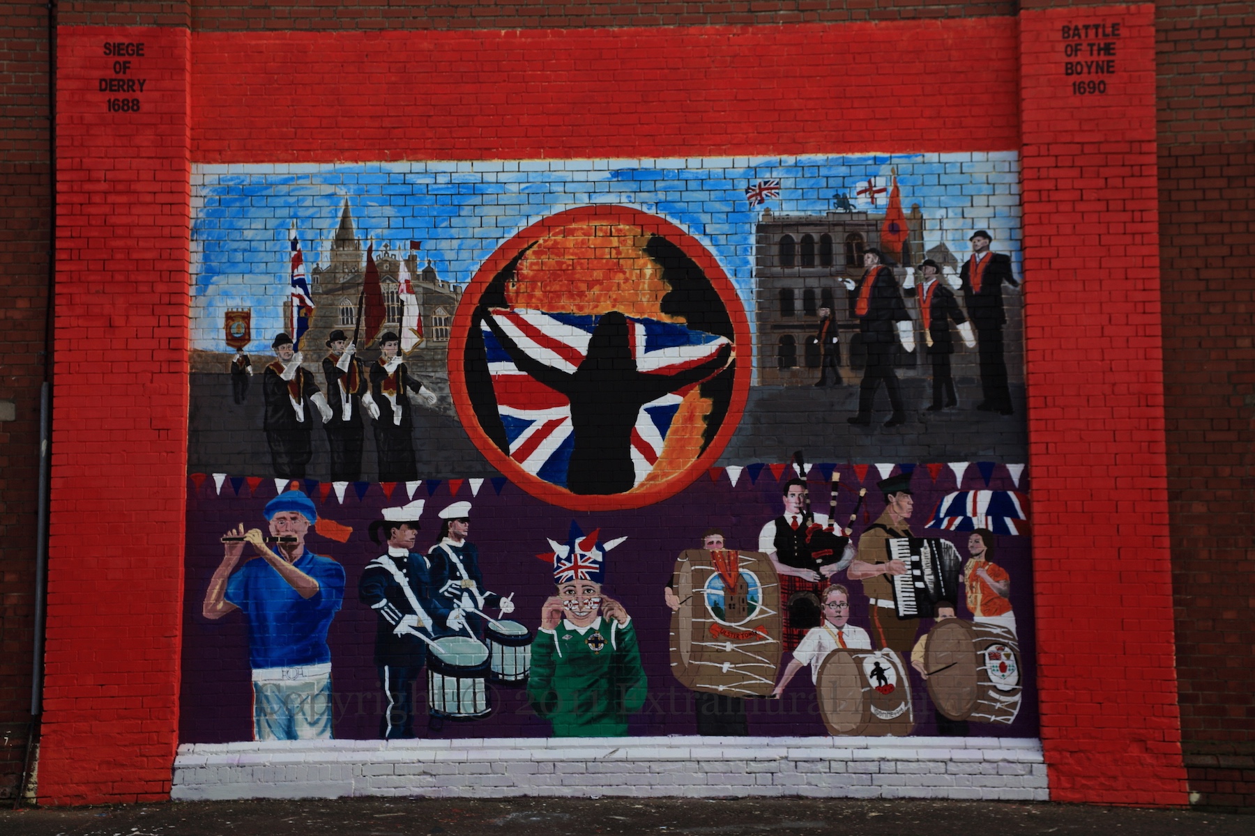 The ‘Civil and religious liberty for all’ mural in Cambrai street was ‘in progress’ for a long time. These images are from October 20th (first two) and November 7th (last two), 2011. The mural, showing parades, bonfires, and Northern Ireland football, would eventually be completed in 2012 – see M08228.