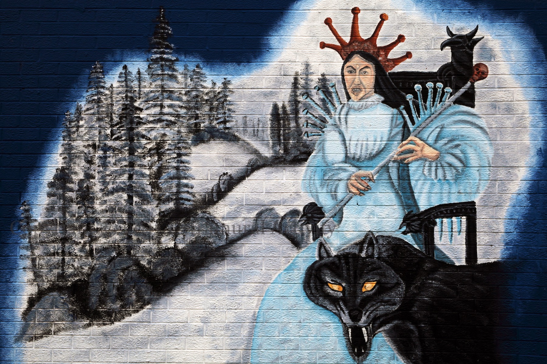 Here are three close-ups from the mural CS Lewis’s book The Lion, The Witch & The Wardrobe in Convention Court, east Belfast. (For the whole, see M02946.)