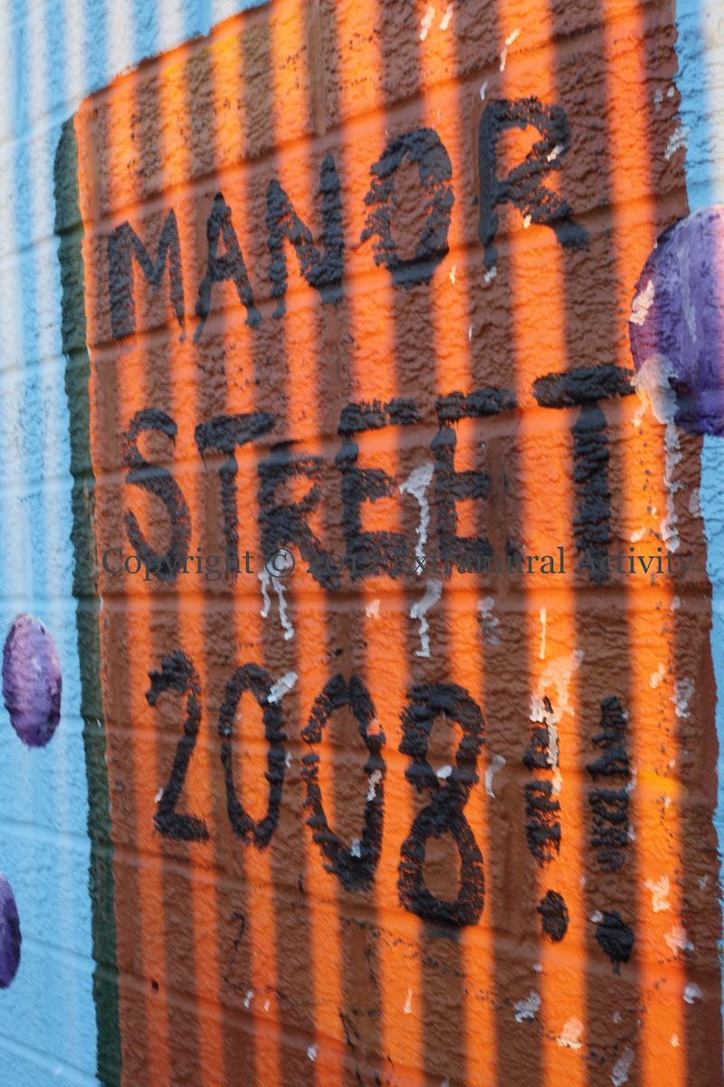Two pieces of graffiti art on the Cliftonville “peace” line: “Breakin’ BarrieRs”, as though the “peace” line should come down, but also “Respect R Streets”, if you do break through. With a signature panel on the wall of bubbles (not shown).