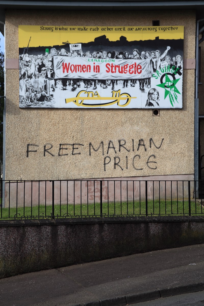 “Strong is what we make each other until we are strong together.” Women in struggle, (clockwise) banging binlids, undergoing strip searches, protesting internment, victims of plastic bullets (Julie Livingstone), fighting in Cumann Na mBan. On the right are the astrological symbol for woman and the republican symbol of “Saoirse” with the green star and fist. With “Free Marian Price” graffiti.