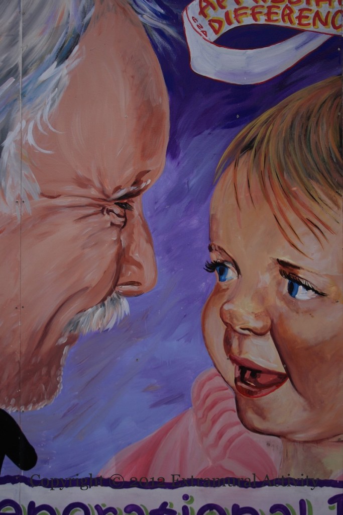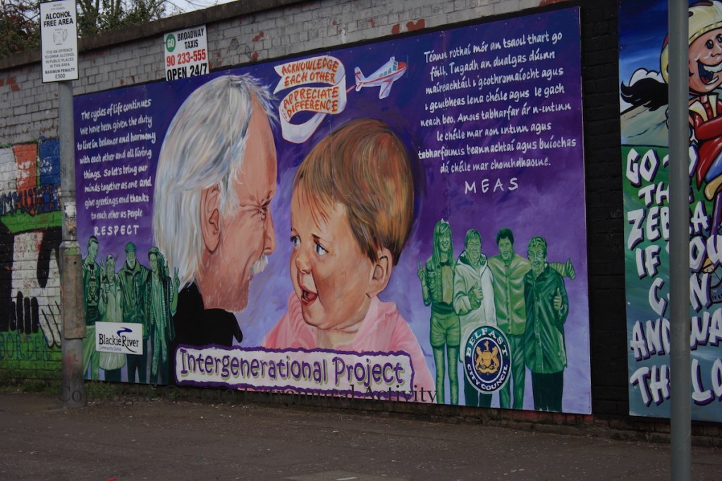 “Téann rothaí mór an tsaoıl thart go fóıll. Tugadh an dualgas dúınn máıreachtáıl ı gcothromaíocht agus ı gcuıbheas lena chéıle agus le gach neach boe. Anoıs tabharfar ár n-ıntınn le chéıle mar aon ıntınn agus tabharfaımıs beannachtaí agus buíochas dá chéıle mar chomhdhaoıne. Meas” With sponsorship from Blackie River Community and Belfast City Council.