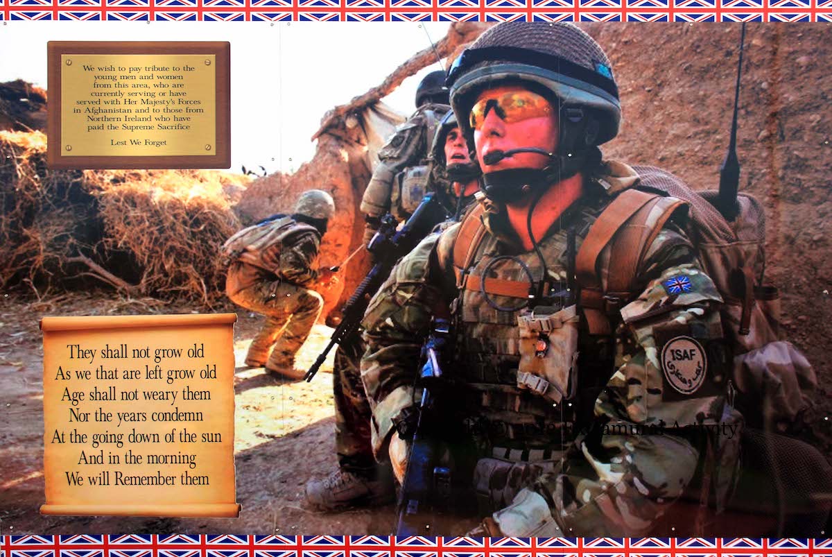 This is a recent mural to British forces in Linn Road, Larne. The larger piece of writing on the board above reads, “We wish to pay tribute to the young men and women from this area, who are currently serving or have served with Her Majesty’s Forces in Afghanistan and to those from Northern Ireland who have paid the Surpreme Sacrifice. Lest we forget”.