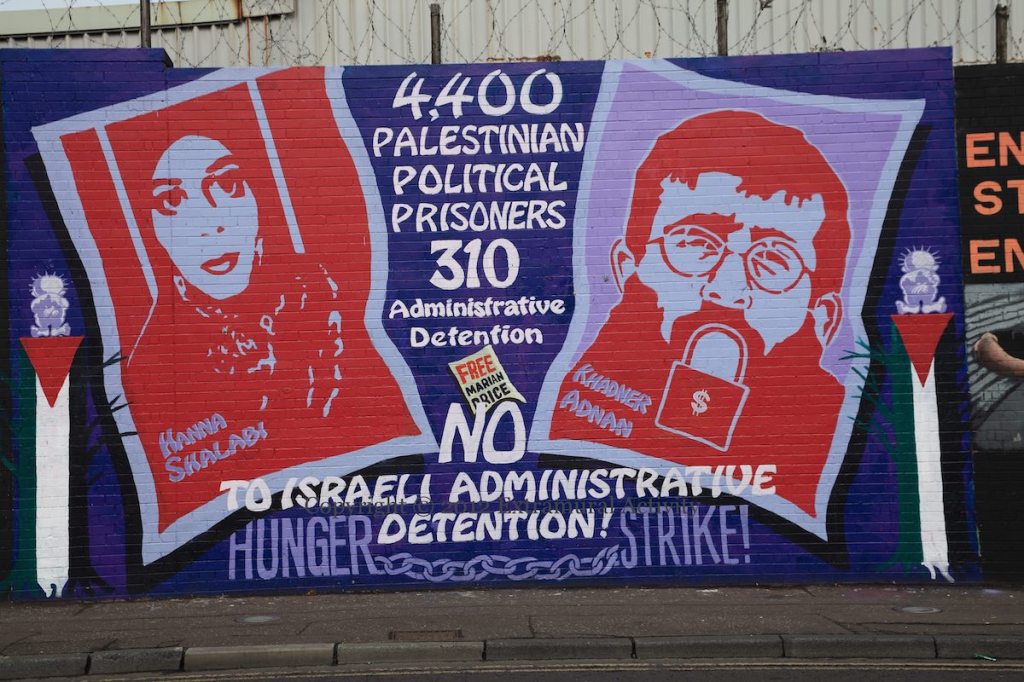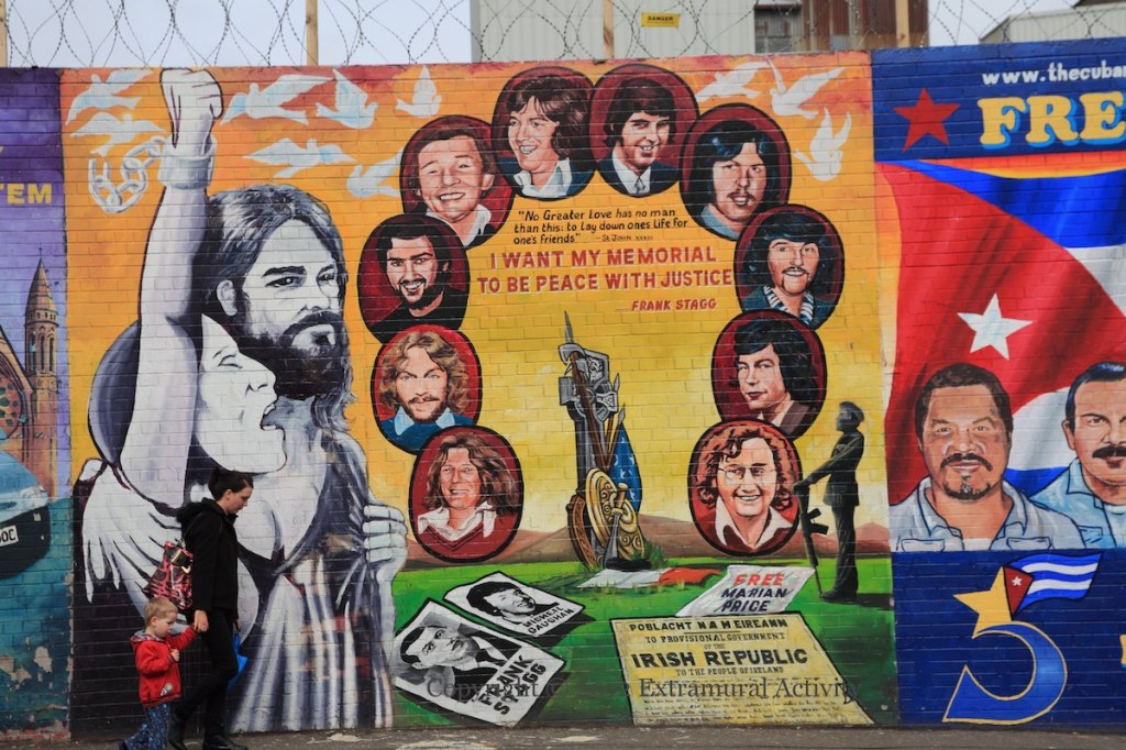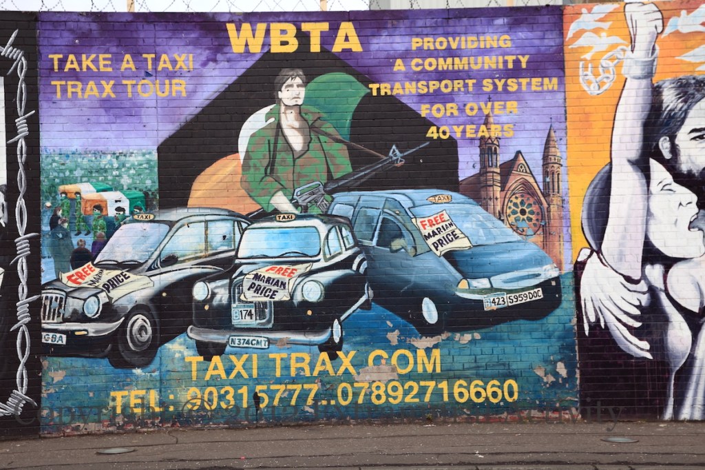 In March or April of 2012, many of the murals on the International Wall were modified to include ‘posters’ for the ‘Free Marian Price’ campaign, including the ’40 year’ black taxi mural shown above. As a member of the IRA, Price was jailed for the Old Bailey bombing in 1973, and her post-Agreement license was revoked in May, 2011, when she was charged, as a member of the Real IRA, in connection with the Massereene Barracks shooting of 2009 – she was sent to Maghaberry. Starting in June, 2011, graffiti and art calling for her release began appearing.