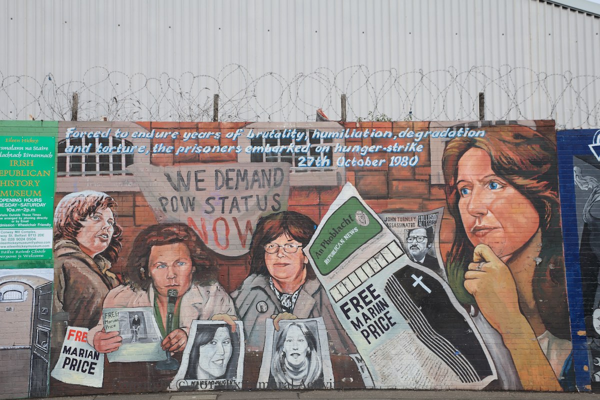 In March or April of 2012, many of the murals on the International Wall were modified to include ‘posters’ for the ‘Free Marian Price’ campaign, including the ’40 year’ black taxi mural shown above. As a member of the IRA, Price was jailed for the Old Bailey bombing in 1973, and her post-Agreement license was revoked in May, 2011, when she was charged, as a member of the Real IRA, in connection with the Massereene Barracks shooting of 2009 – she was sent to Maghaberry. Starting in June, 2011, graffiti and art calling for her release began appearing.