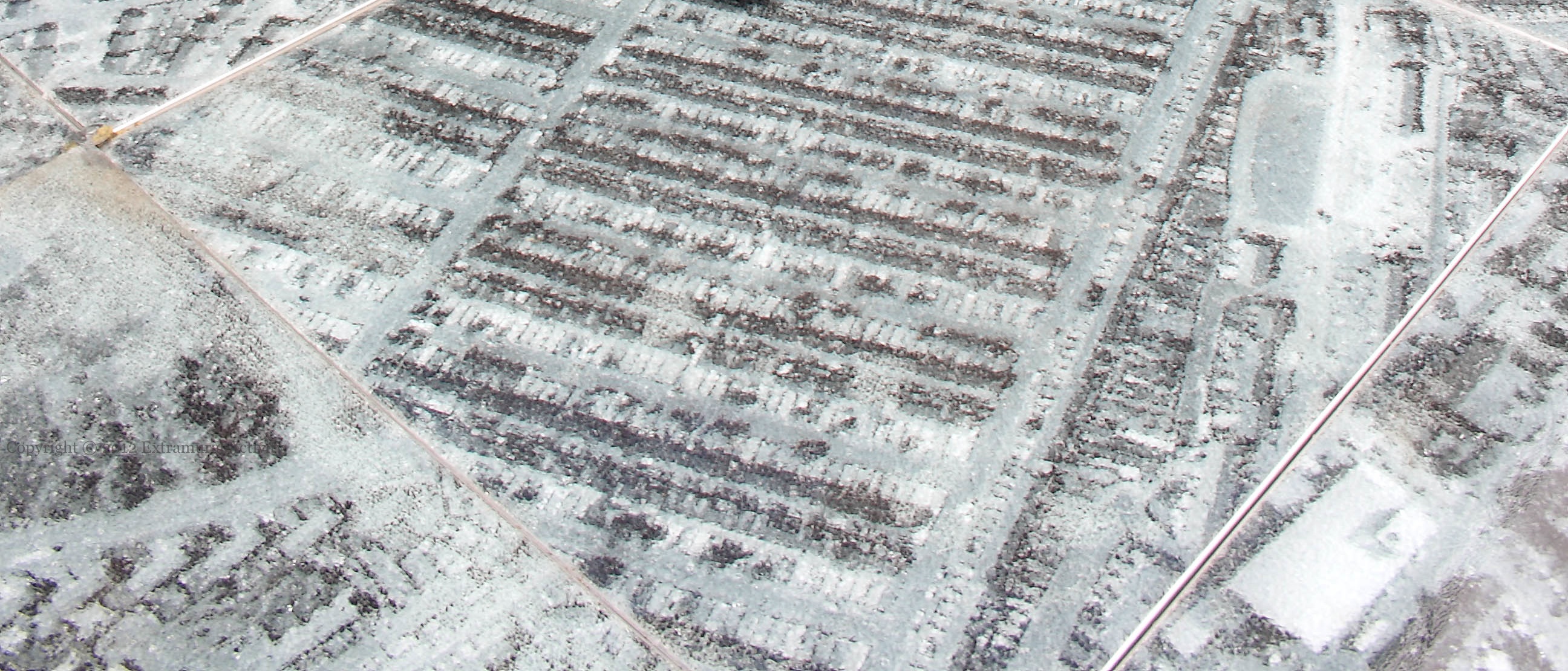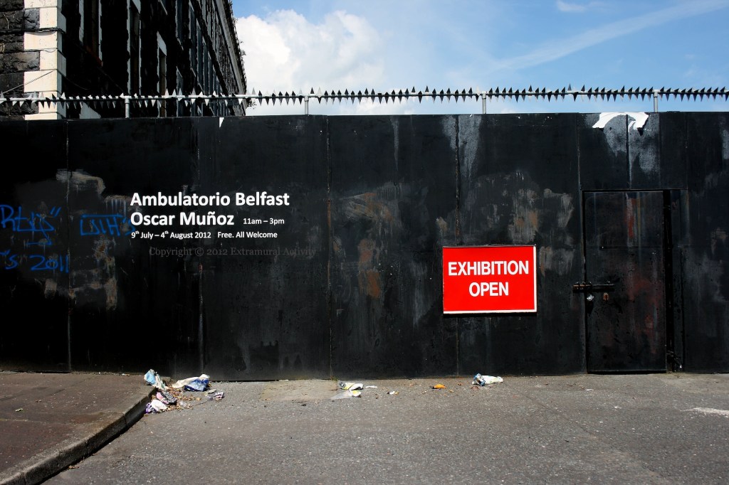 The big red sign usually says “Road Closed” but has been changed for the exhibition. On this day, however, the exhibition (which is a large satellite-image map of the area, on the ground) was not, in fact, open. The Flax St/Crumlin Road interface, Ardoyne, the day after the 2012 riot.