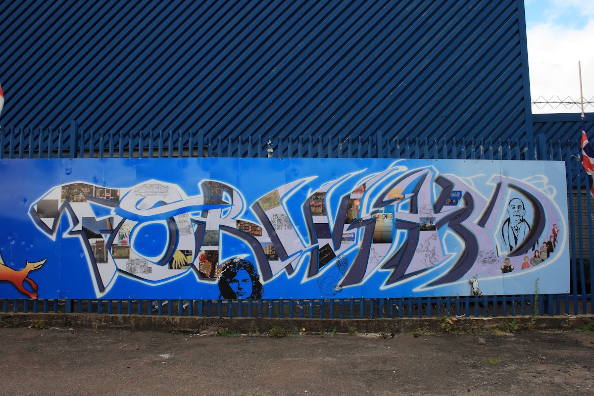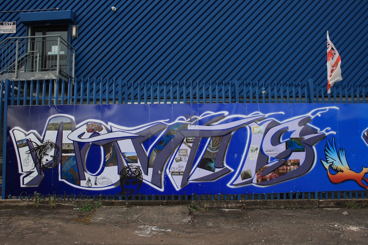 Wild-style writing is combined with images of local street signs and portraits of east Belfast luminaries such as George Best, Van Morrison, and CS Lewis.