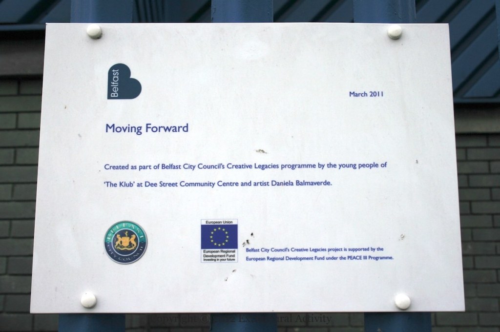 “Created as part of Belfast City Council’s Creative Legacies programme by the young people of ‘The Klub’ at Dee Street Community Centre and artist Daniela Balmaverde. With PEACE III funding.