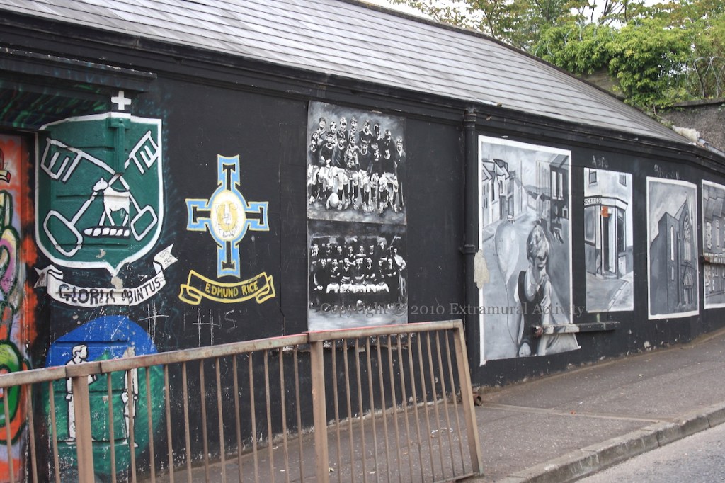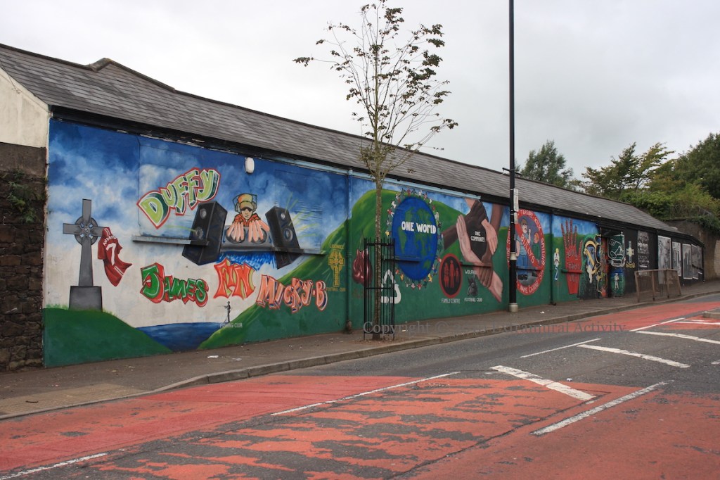 The new mural at Mountainhill Youth Club follows the same format as its predecessor, with the left side being social messages directed at kids and the right being “the village [i.e. Ligoniel] in older times”.