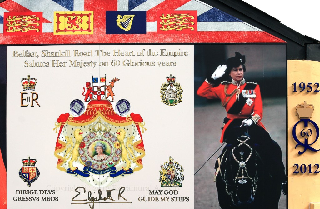X00619 X00624 Belfast, Shankill Road the heart of the empire salutes her majesty on 60 glorious years, dirige deus gressus meos, may god guide my steps, je maintiendrai, to commemorate her majesty the queen’s diamond jubilee, elizabeth r, ERII, 1952 2012