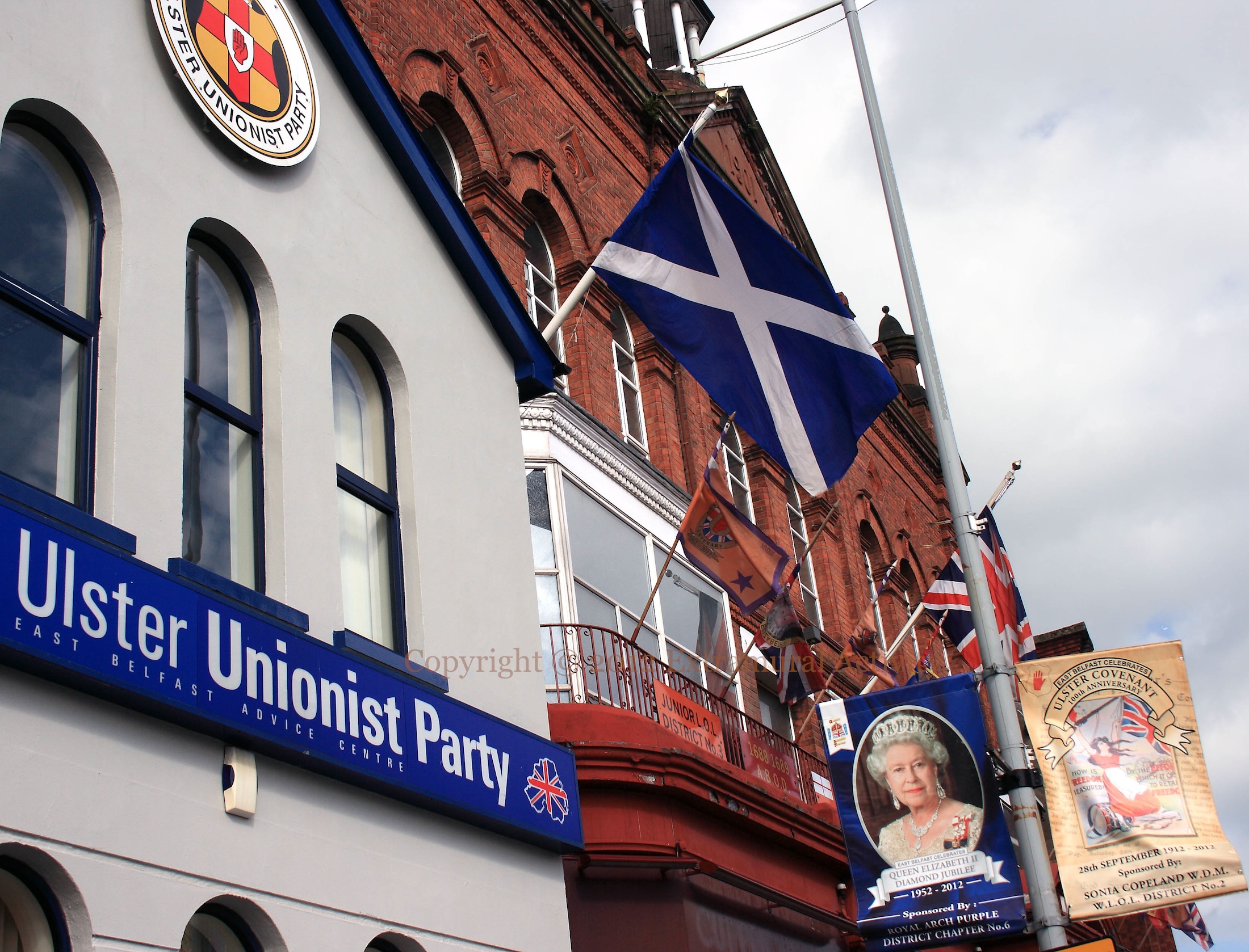 X00617 ulster unionist party, east belfast advice centre, junior l.o.l. queen elizabeth diamond jubilee, 1952-2012 sponsored by royal arch purple district chapter no. 6, east belfast celebrates ulster covenant 100th anniversary, 28th september 1912-2012, sonia copeland, w.d.m., w.l.o.l. district no. 2